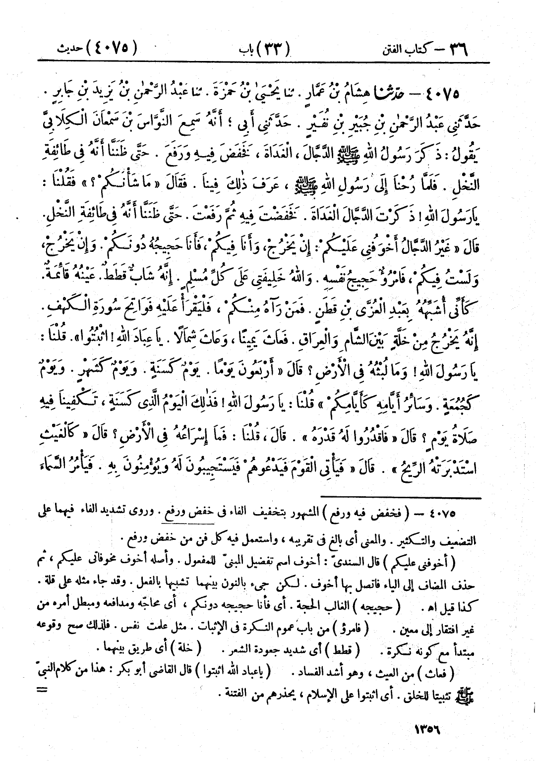 4075 - حَدَّثَنَا هِشَامُ بْنُ عَمَّارٍ قَالَ: حَدَّثَنَا يَحْيَى بْنُ حَمْزَةَ قَالَ: حَدَّثَنَا عَبْدُ الرَّحْمَنِ بْنُ يَزِيدَ بْنِ جَابِرٍ قَالَ: حَدَّثَنِي عَبْدُ الرَّحْمَنِ بْنُ جُبَيْرِ بْنِ نُفَيْرٍ قَالَ: حَدَّثَنِي أَبِي، أَنَّهُ سَمِعَ النَّوَّاسَ بْنَ سَمْعَانَ الْكِلَابِيَّ، يَقُولُ: ذَكَرَ رَسُولُ اللَّهِ صَلَّى اللهُ عَلَيْهِ وَسَلَّمَ الدَّجَّالَ الْغَدَاةَ، فَخَفَضَ فِيهِ وَرَفَعَ، حَتَّى ظَنَنَّا أَنَّهُ فِي طَائِفَةِ النَّخْلِ، فَلَمَّا رُحْنَا إِلَى رَسُولِ اللَّهِ صَلَّى اللهُ عَلَيْهِ وَسَلَّمَ، عَرَفَ ذَلِكَ فِينَا، فَقَالَ: «مَا شَأْنُكُمْ؟» فَقُلْنَا: يَا رَسُولَ اللَّهِ ذَكَرْتَ الدَّجَّالَ الْغَدَاةَ، فَخَفَضْتَ فِيهِ ثُمَّ رَفَعْتَ، حَتَّى ظَنَنَّا أَنَّهُ فِي طَائِفَةِ النَّخْلِ، قَالَ: " §غَيْرُ الدَّجَّالِ أَخْوَفُنِي عَلَيْكُمْ: إِنْ يَخْرُجْ وَأَنَا فِيكُمْ فَأَنَا حَجِيجُهُ دُونَكُمْ، وَإِنْ يَخْرُجْ وَلَسْتُ فِيكُمْ، فَامْرُؤٌ حَجِيجُ نَفْسِهِ، وَاللَّهُ خَلِيفَتِي عَلَى كُلِّ مُسْلِمٍ، إِنَّهُ شَابٌّ قَطَطٌ، عَيْنُهُ قَائِمَةٌ، كَأَنِّي أُشَبِّهُهُ بِعَبْدِ الْعُزَّى بْنِ قَطَنٍ، فَمَنْ رَآهُ مِنْكُمْ، فَلْيَقْرَأْ عَلَيْهِ فَوَاتِحَ سُورَةِ الْكَهْفِ، إِنَّهُ يَخْرُجُ مِنْ خَلَّةٍ بَيْنَ الشَّامِ، وَالْعِرَاقِ، فَعَاثَ يَمِينًا، وَعَاثَ شِمَالًا، يَا عِبَادَ اللَّهِ اثْبُتُوا "، قُلْنَا: يَا رَسُولَ اللَّهِ وَمَا لُبْثُهُ فِي الْأَرْضِ؟ قَالَ «أَرْبَعُونَ يَوْمًا، يَوْمٌ كَسَنَةٍ، وَيَوْمٌ كَشَهْرٍ، وَيَوْمٌ كَجُمُعَةٍ، وَسَائِرُ أَيَّامِهِ كَأَيَّامِكُمْ» ، قُلْنَا: يَا رَسُولَ اللَّهِ فَذَلِكَ الْيَوْمُ الَّذِي كَسَنَةٍ، تَكْفِينَا فِيهِ صَلَاةُ يَوْمٍ؟ قَالَ: «فَاقْدُرُوا لَهُ قَدْرَهُ» ، قَالَ، قُلْنَا: فَمَا إِسْرَاعُهُ فِي الْأَرْضِ؟ قَالَ: «كَالْغَيْثِ اسْتَدْبَرَتْهُ الرِّيحُ» ، قَالَ: " فَيَأْتِي الْقَوْمَ فَيَدْعُوهُمْ فَيَسْتَجِيبُونَ لَهُ، وَيُؤْمِنُونَ بِهِ، فَيَأْمُرُ السَّمَاءَ أَنْ تُمْطِرَ فَتُمْطِرَ، وَيَأْمُرُ الْأَرْضَ أَنْ تُنْبِتَ فَتُنْبِتَ، وَتَرُوحُ عَلَيْهِمْ سَارِحَتُهُمْ أَطْوَلَ مَا كَانَتْ ذُرًى، وَأَسْبَغَهُ ضُرُوعًا، وَأَمَدَّهُ خَوَاصِرَ، ثُمَّ يَأْتِي الْقَوْمَ فَيَدْعُوهُمْ فَيَرُدُّونَ عَلَيْهِ قَوْلَهُ، فَيَنْصَرِفُ عَنْهُمْ فَيُصْبِحُونَ مُمْحِلِينَ، مَا بِأَيْدِيهِمْ شَيْءٌ، ثُمَّ يَمُرَّ بِالْخَرِبَةِ، فَيَقُولُ لَهَا: أَخْرِجِي كُنُوزَكِ فَيَنْطَلِقُ، فَتَتْبَعُهُ كُنُوزُهَا كَيَعَاسِيبِ النَّحْلِ، ثُمَّ يَدْعُو رَجُلًا مُمْتَلِئًا شَبَابًا، فَيَضْرِبُهُ بِالسَّيْفِ ضَرْبَةً، فَيَقْطَعُهُ جِزْلَتَيْنِ، رَمْيَةَ الْغَرَضِ، ثُمَّ يَدْعُوهُ، فَيُقْبِلُ يَتَهَلَّلُ وَجْهُهُ يَضْحَكُ، فَبَيْنَمَا هُمْ كَذَلِكَ، إِذْ بَعَثَ اللَّهُ عِيسَى ابْنَ مَرْيَمَ، فَيَنْزِلُ عِنْدَ الْمَنَارَةِ الْبَيْضَاءِ، شَرْقِيَّ دِمَشْقَ، بَيْنَ مَهْرُودَتَيْنِ، وَاضِعًا كَفَّيْهِ عَلَى أَجْنِحَةِ مَلَكَيْنِ، إِذَا طَأْطَأَ رَأْسَهُ قَطَرَ، وَإِذَا رَفَعَهُ يَنْحَدِرُ مِنْهُ جُمَانٌ كَاللُّؤْلُؤِ، وَلَا يَحِلُّ لِكَافِرٍ يَجِدُ رِيحَ نَفَسِهِ إِلَّا مَاتَ، وَنَفَسُهُ يَنْتَهِي حَيْثُ يَنْتَهِي طَرَفُهُ، فَيَنْطَلِقُ حَتَّى يُدْرِكَهُ عِنْدَ بَابِ لُدٍّ، فَيَقْتُلُهُ، ثُمَّ يَأْتِي نَبِيُّ اللَّهِ عِيسَى، قَوْمًا قَدْ عَصَمَهُمُ اللَّهُ، فَيَمْسَحُ وُجُوهَهُمْ، وَيُحَدِّثُهُمْ بِدَرَجَاتِهِمْ فِي الْجَنَّةِ، فَبَيْنَمَا هُمْ كَذَلِكَ إِذْ أَوْحَى اللَّهُ إِلَيْهِ: يَا عِيسَى إِنِّي قَدْ أَخْرَجْتُ عِبَادًا لِي، لَا يَدَانِ لِأَحَدٍ بِقِتَالِهِمْ، وَأَحْرِزْ عِبَادِي إِلَى الطُّورِ، وَ