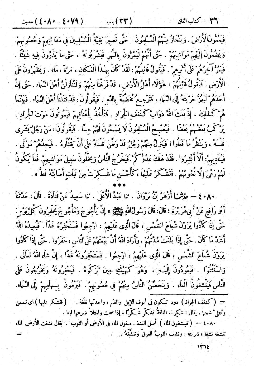 4080 - حَدَّثَنَا أَزْهَرُ بْنُ مَرْوَانَ قَالَ: حَدَّثَنَا عَبْدُ الْأَعْلَى قَالَ: حَدَّثَنَا سَعِيدٌ، عَنْ قَتَادَةَ، قَالَ: حَدَّثَنَا أَبُو رَافِعٍ، عَنْ أَبِي هُرَيْرَةَ، قَالَ: قَالَ رَسُولُ اللَّهِ صَلَّى اللهُ عَلَيْهِ وَسَلَّمَ: " إِنَّ §يَأْجُوجَ، وَمَأْجُوجَ يَحْفِرُونَ كُلَّ يَوْمٍ، حَتَّى إِذَا كَادُوا يَرَوْنَ شُعَاعَ الشَّمْسِ، قَالَ الَّذِي عَلَيْهِمْ: ارْجِعُوا فَسَنَحْفِرُهُ غَدًا، فَيُعِيدُهُ اللَّهُ أَشَدَّ مَا كَانَ، حَتَّى إِذَا بَلَغَتْ مُدَّتُهُمْ، وَأَرَادَ اللَّهُ أَنْ يَبْعَثَهُمْ عَلَى النَّاسِ، حَفَرُوا، حَتَّى إِذَا كَادُوا يَرَوْنَ شُعَاعَ الشَّمْسِ، قَالَ الَّذِي عَلَيْهِمْ: ارْجِعُوا، فَسَتَحْفِرُونَهُ غَدًا، إِنْ شَاءَ اللَّهُ تَعَالَى، وَاسْتَثْنَوْا، فَيَعُودُونَ إِلَيْهِ، وَهُوَ كَهَيْئَتِهِ حِينَ تَرَكُوهُ، فَيَحْفِرُونَهُ وَيَخْرُجُونَ عَلَى النَّاسِ فَيُنْشِفُونَ الْمَاءَ، وَيَتَحَصَّنُ النَّاسُ مِنْهُمْ فِي حُصُونِهِمْ، فَيَرْمُونَ بِسِهَامِهِمْ إِلَى السَّمَاءِ، فَتَرْجِعُ عَلَيْهَا الدَّمُ الَّذِي اجْفَظَّ، فَيَقُولُونَ: قَهَرْنَا أَهْلَ الْأَرْضِ، وَعَلَوْنَا أَهْلَ السَّمَاءِ، فَيَبْعَثُ اللَّهُ نَغَفًا فِي أَقْفَائِهِمْ، فَيَقْتُلُهُمْ بِهَا "، قَالَ رَسُولُ اللَّهِ صَلَّى اللهُ عَلَيْهِ وَسَلَّمَ: «وَالَّذِي نَفْسِي بِيَدِهِ إِنَّ دَوَابَّ الْأَرْضِ لَتَسْمَنُ، وَتَشْكَرُ شَكَرًا، مِنْ لُحُومِهِمْ»