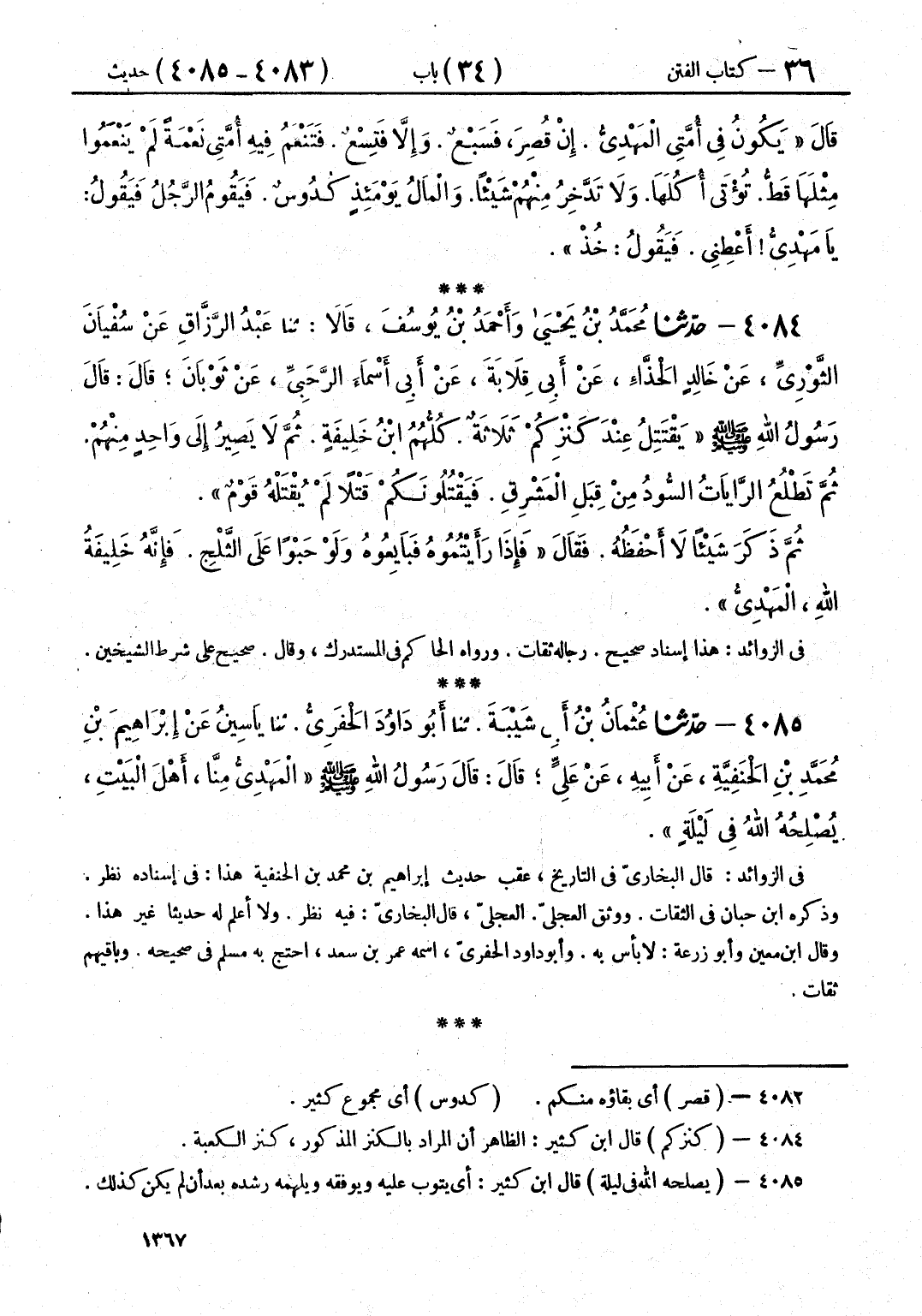 4084 - حَدَّثَنَا مُحَمَّدُ بْنُ يَحْيَى، وَأَحْمَدُ بْنُ يُوسُفَ، قَالَا: حَدَّثَنَا عَبْدُ الرَّزَّاقِ، عَنْ سُفْيَانَ الثَّوْرِيِّ، عَنْ خَالِدٍ الْحَذَّاءِ، عَنْ أَبِي قِلَابَةَ، عَنْ أَبِي أَسْمَاءَ الرَّحَبِيِّ، عَنْ ثَوْبَانَ، قَالَ: قَالَ رَسُولُ اللَّهِ صَلَّى اللهُ عَلَيْهِ وَسَلَّمَ: «§يَقْتَتِلُ عِنْدَ كَنْزِكُمْ ثَلَاثَةٌ، كُلُّهُمُ ابْنُ خَلِيفَةٍ، ثُمَّ لَا يَصِيرُ إِلَى وَاحِدٍ مِنْهُمْ، ثُمَّ تَطْلُعُ الرَّايَاتُ السُّودُ مِنْ قِبَلِ الْمَشْرِقِ، فَيَقْتُلُونَكُمْ قَتْلًا لَمْ يُقْتَلْهُ قَوْمٌ» - ثُمَّ ذَكَرَ شَيْئًا لَا أَحْفَظُهُ فَقَالَ - فَإِذَا رَأَيْتُمُوهُ فَبَايِعُوهُ وَلَوْ حَبْوًا عَلَى الثَّلْجِ، فَإِنَّهُ خَلِيفَةُ اللَّهِ الْمَهْدِيُّ "