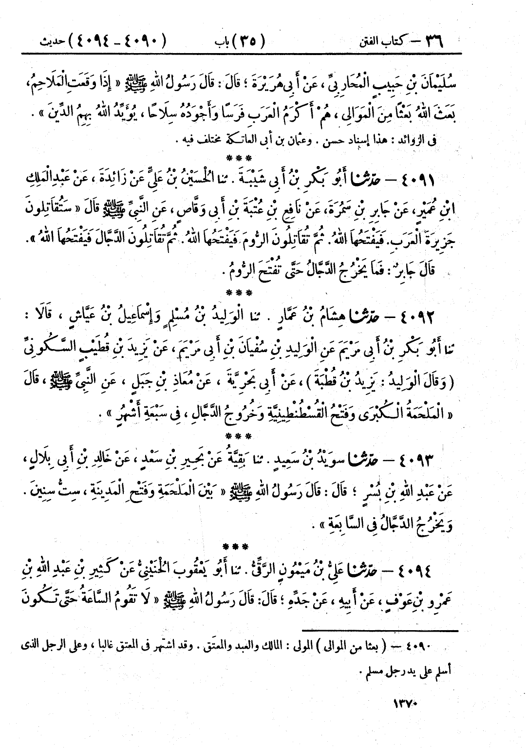 4092 - هِشَامُ بْنُ عَمَّارٍ قَالَ: حَدَّثَنَا الْوَلِيدُ بْنُ مُسْلِمٍ، وَإِسْمَاعِيلُ بْنُ عَيَّاشٍ، قَالَا: حَدَّثَنَا أَبُو بَكْرِ بْنُ أَبِي مَرْيَمَ، عَنِ الْوَلِيدِ بْنِ سُفْيَانَ بْنِ أَبِي مَرْيَمَ، عَنْ يَزِيدَ بْنِ قُطَيْبٍ السَّكُونِيِّ، وَقَالَ الْوَلِيدُ: يَزِيدُ بْنُ قُطْبَةَ، عَنْ أَبِي بَحْرِيَّةَ، عَنْ مُعَاذِ بْنِ جَبَلٍ، عَنِ النَّبِيِّ صَلَّى اللهُ عَلَيْهِ وَسَلَّمَ، قَالَ: «§الْمَلْحَمَةُ الْكُبْرَى، وَفَتْحُ الْقُسْطَنْطِينِيَّةِ، وَخُرُوجُ الدَّجَّالِ فِي سَبْعَةِ أَشْهُرٍ»