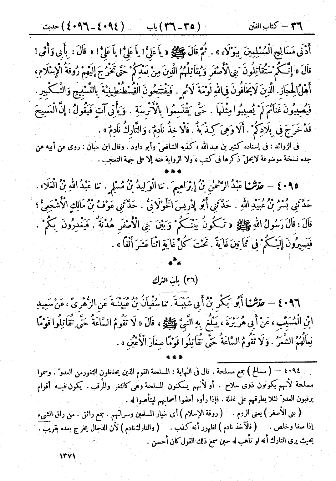 4095 - حَدَّثَنَا عَبْدُ الرَّحْمَنِ بْنُ إِبْرَاهِيمَ قَالَ: حَدَّثَنَا الْوَلِيدُ بْنُ مُسْلِمٍ قَالَ: حَدَّثَنَا عَبْدُ اللَّهِ بْنُ الْعَلَاءِ قَالَ: حَدَّثَنِي بُسْرُ بْنُ عُبَيْدِ اللَّهِ قَالَ: حَدَّثَنِي أَبُو إِدْرِيسَ الْخَوْلَانِيُّ قَالَ: حَدَّثَنِي عَوْفُ بْنُ مَالِكٍ الْأَشْجَعِيُّ، قَالَ: قَالَ رَسُولُ اللَّهِ صَلَّى اللهُ عَلَيْهِ وَسَلَّمَ: «§تَكُونُ بَيْنَكُمْ وَبَيْنَ بَنِي الْأَصْفَرِ هُدْنَةٌ، فَيَغْدِرُونَ بِكُمْ، فَيَسِيرُونَ إِلَيْكُمْ فِي ثَمَانِينَ غَايَةً، تَحْتَ كُلِّ غَايَةٍ اثْنَا عَشَرَ أَلْفًا»