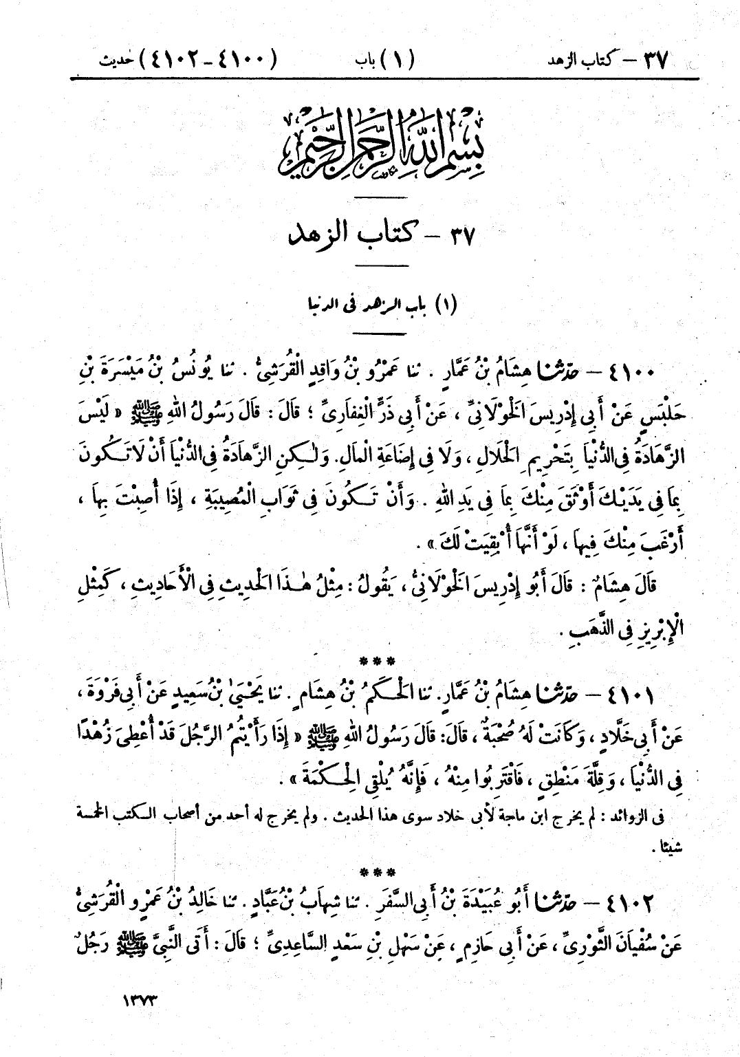 4100 - حَدَّثَنَا هِشَامُ بْنُ عَمَّارٍ قَالَ: حَدَّثَنَا عَمْرُو بْنُ وَاقِدٍ الْقُرَشِيُّ قَالَ: حَدَّثَنَا يُونُسُ بْنُ مَيْسَرَةَ بْنِ حَلْبَسٍ، عَنْ أَبِي إِدْرِيسَ الْخَوْلَانِيِّ، عَنْ أَبِي ذَرٍّ الْغِفَارِيِّ، قَالَ: قَالَ رَسُولُ اللَّهِ صَلَّى اللهُ عَلَيْهِ وَسَلَّمَ: «§لَيْسَ الزَّهَادَةُ فِي الدُّنْيَا بِتَحْرِيمِ الْحَلَالِ، وَلَا فِي إِضَاعَةِ الْمَالِ، وَلَكِنِ الزَّهَادَةُ فِي الدُّنْيَا أَنْ لَا تَكُونَ بِمَا فِي يَدَيْكَ أَوْثَقَ مِنْكَ بِمَا فِي يَدِ اللَّهِ، وَأَنْ تَكُونَ فِي ثَوَابِ الْمُصِيبَةِ، إِذَا أُصِبْتَ بِهَا، أَرْغَبَ مِنْكَ فِيهَا، لَوْ أَنَّهَا أُبْقِيَتْ لَكَ» قَالَ هِشَامٌ: " كَانَ أَبُو إِدْرِيسَ الْخَوْلَانِيُّ، يَقُولُ: مِثْلُ هَذَا الْحَدِيثِ فِي الْأَحَادِيثِ، كَمِثْلِ الْإِبْرِيزِ فِي الذَّهَبِ "