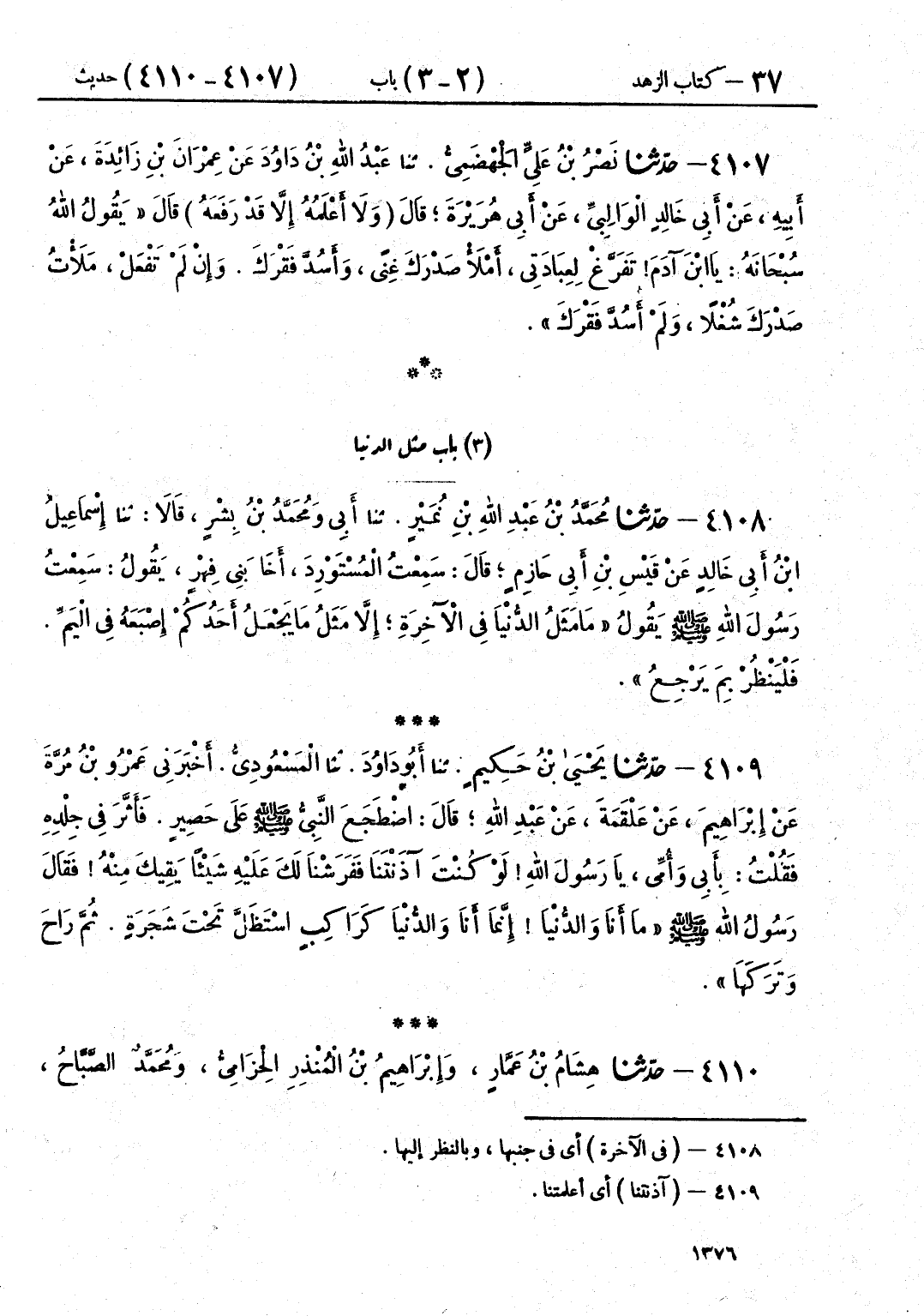 4109 - حَدَّثَنَا يَحْيَى بْنُ حَكِيمٍ قَالَ: حَدَّثَنَا أَبُو دَاوُدَ قَالَ: حَدَّثَنَا الْمَسْعُودِيُّ قَالَ: أَخْبَرَنِي عَمْرُو بْنُ مُرَّةَ، عَنْ إِبْرَاهِيمَ، عَنْ عَلْقَمَةَ، عَنْ عَبْدِ اللَّهِ، قَالَ: اضْطَجَعَ النَّبِيُّ صَلَّى اللهُ عَلَيْهِ وَسَلَّمَ، عَلَى حَصِيرٍ فَأَثَّرَ فِي جِلْدِهِ، فَقُلْتُ: بِأَبِي وَأُمِّي، يَا رَسُولَ اللَّهِ لَوْ كُنْتَ آذَنْتَنَا فَفَرَشْنَا لَكَ عَلَيْهِ شَيْئًا يَقِيكَ مِنْهُ، فَقَالَ رَسُولُ اللَّهِ صَلَّى اللهُ عَلَيْهِ وَسَلَّمَ: «§مَا أَنَا وَالدُّنْيَا إِنَّمَا أَنَا وَالدُّنْيَا كَرَاكِبٍ اسْتَظَلَّ تَحْتَ شَجَرَةٍ، ثُمَّ رَاحَ وَتَرَكَهَا»