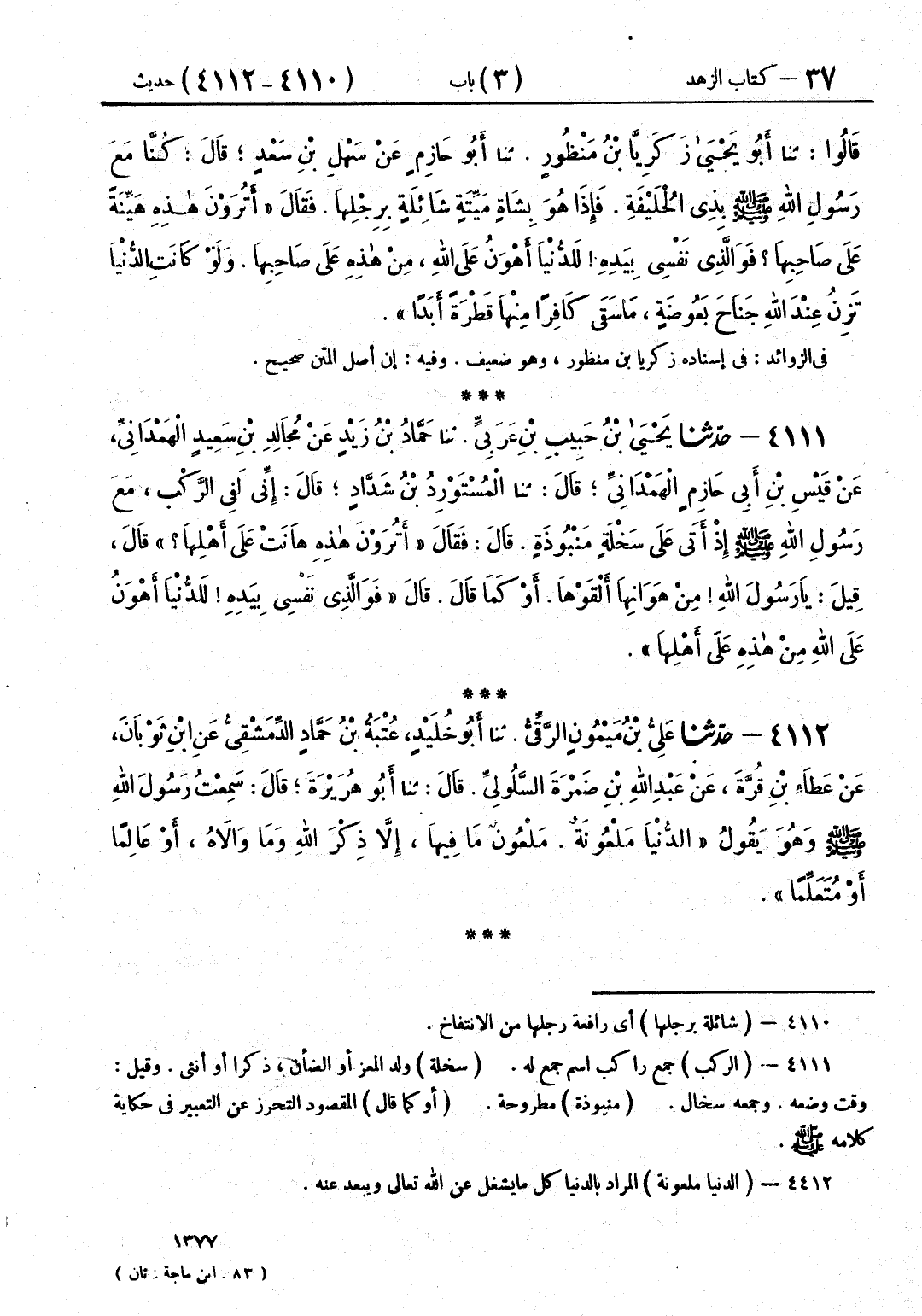 4111 - حَدَّثَنَا يَحْيَى بْنُ حَبِيبِ بْنِ عَرَبِيٍّ قَالَ: حَدَّثَنَا حَمَّادُ بْنُ زَيْدٍ، عَنْ مُجَالِدِ بْنِ سَعِيدٍ الْهَمْدَانِيِّ، عَنْ قَيْسِ بْنِ أَبِي حَازِمٍ الْهَمْدَانِيِّ، قَالَ: حَدَّثَنَا الْمُسْتَوْرِدُ بْنُ شَدَّادٍ، قَالَ: إِنِّي لَفِي الرَّكْبِ مَعَ رَسُولِ اللَّهِ صَلَّى اللهُ عَلَيْهِ وَسَلَّمَ، إِذْ أَتَى عَلَى سَخْلَةٍ مَنْبُوذَةٍ، قَالَ: فَقَالَ: «أَتُرَوْنَ هَذِهِ هَانَتْ عَلَى أَهْلِهَا» قَالَ: قِيلَ: يَا رَسُولَ اللَّهِ مِنْ هَوَانِهَا، أَلْقَوْهَا، أَوْ كَمَا قَالَ: قَالَ: «فَوَالَّذِي نَفْسِي بِيَدِهِ §لَلدُّنْيَا أَهْوَنُ عَلَى اللَّهِ مِنْ هَذِهِ عَلَى أَهْلِهَا»