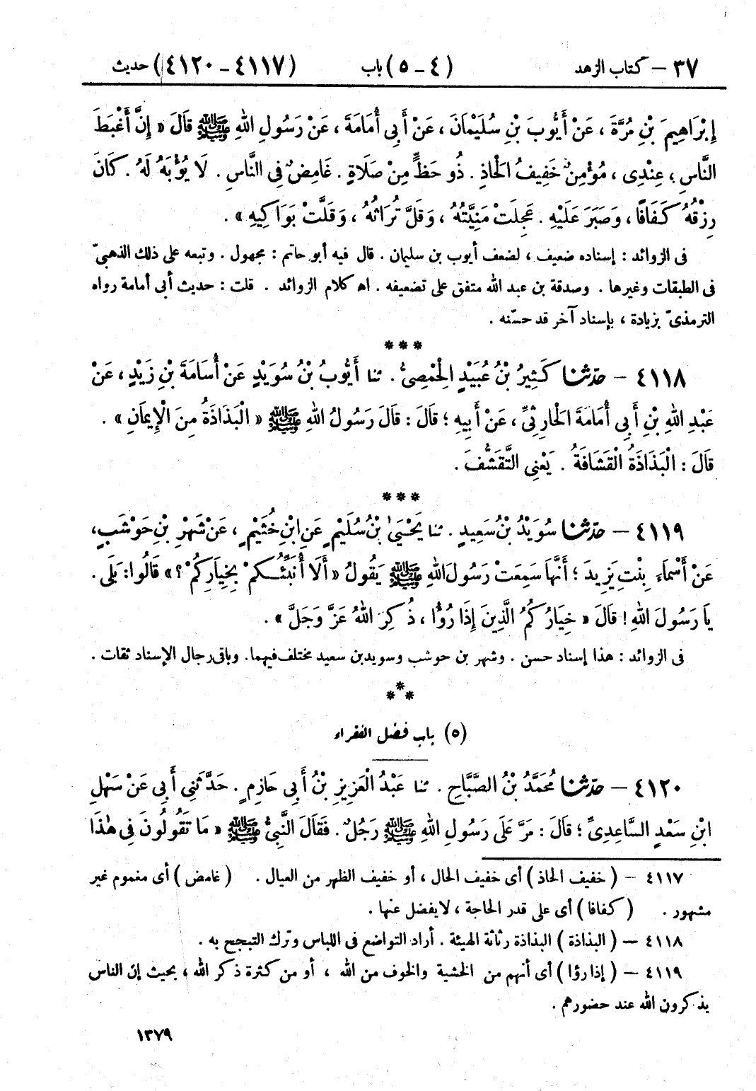 4118 - كَثِيرُ بْنُ عُبَيْدٍ الْحِمْصِيُّ قَالَ: حَدَّثَنَا أَيُّوبُ بْنُ سُوَيْدٍ، عَنْ أُسَامَةَ بْنِ زَيْدٍ، عَنْ عَبْدِ اللَّهِ بْنِ أَبِي أُمَامَةَ الْحَارِثِيِّ، عَنْ أَبِيهِ، قَالَ: قَالَ رَسُولُ اللَّهِ صَلَّى اللهُ عَلَيْهِ وَسَلَّمَ: «§الْبَذَاذَةُ مِنَ الْإِيمَانِ» ، قَالَ: الْبَذَاذَةُ الْقَشَافَةُ، يَعْنِي التَّقَشُّفَ