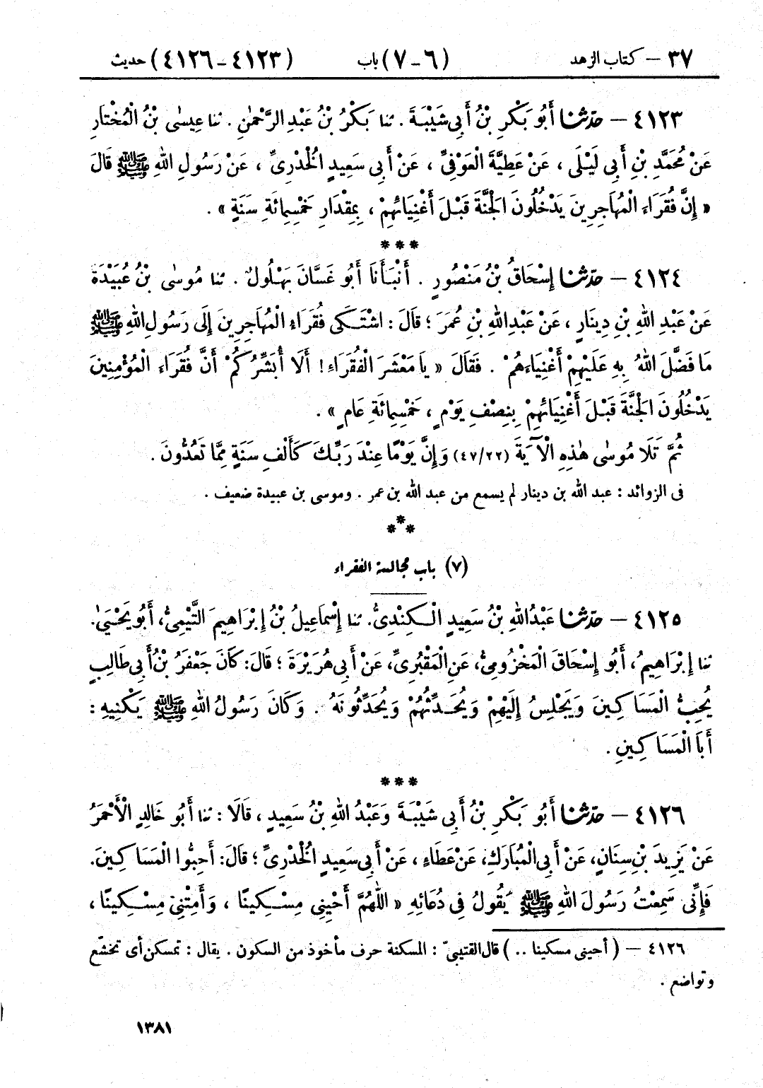 4126 - حَدَّثَنَا أَبُو بَكْرِ بْنُ أَبِي شَيْبَةَ، وَعَبْدُ اللَّهِ بْنُ سَعِيدٍ، قَالَا: حَدَّثَنَا أَبُو خَالِدٍ الْأَحْمَرُ، عَنْ يَزِيدَ بْنِ سِنَانٍ، عَنْ أَبِي الْمُبَارَكِ، عَنْ عَطَاءٍ، عَنْ أَبِي سَعِيدٍ الْخُدْرِيِّ، قَالَ: أَحِبُّوا الْمَسَاكِينَ، فَإِنِّي سَمِعْتُ رَسُولَ اللَّهِ صَلَّى اللهُ عَلَيْهِ وَسَلَّمَ، يَقُولُ فِي دُعَائِهِ: «§اللَّهُمَّ أَحْيِنِي مِسْكِينًا، وَأَمِتْنِي مِسْكِينًا، وَاحْشُرْنِي فِي زُمْرَةِ الْمَسَاكِينِ»