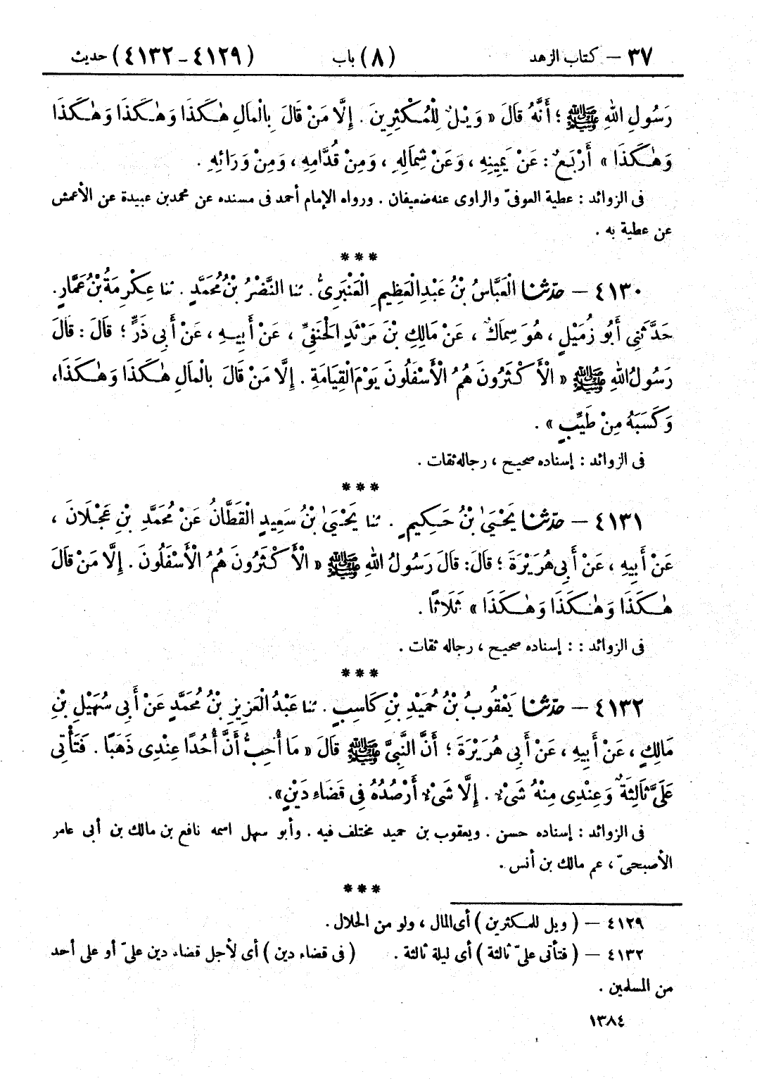 4130 - حَدَّثَنَا الْعَبَّاسُ بْنُ عَبْدِ الْعَظِيمِ الْعَنْبَرِيُّ قَالَ: حَدَّثَنَا النَّضْرُ بْنُ مُحَمَّدٍ قَالَ: حَدَّثَنَا عِكْرِمَةُ بْنُ عَمَّارٍ قَالَ: حَدَّثَنِي أَبُو زُمَيْلٍ هُوَ سِمَاكٌ، عَنْ مَالِكِ بْنِ مَرْثَدٍ الْحَنَفِيِّ، عَنْ أَبِيهِ، عَنْ أَبِي ذَرٍّ، قَالَ: قَالَ رَسُولُ اللَّهِ صَلَّى اللهُ عَلَيْهِ وَسَلَّمَ: «§الْأَكْثَرُونَ هُمُ الْأَسْفَلُونَ يَوْمَ الْقِيَامَةِ، إِلَّا مَنْ قَالَ بِالْمَالِ، هَكَذَا، وَهَكَذَا، وَكَسَبَهُ مِنْ طَيِّبٍ»