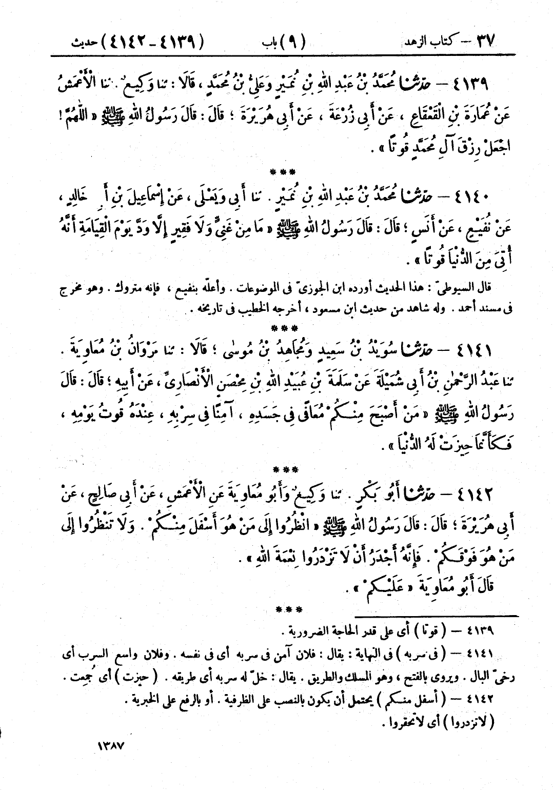 4140 - حَدَّثَنَا مُحَمَّدُ بْنُ عَبْدِ اللَّهِ بْنِ نُمَيْرٍ قَالَ: حَدَّثَنَا أَبِي، وَيَعْلَى، عَنْ إِسْمَاعِيلَ بْنِ أَبِي خَالِدٍ، عَنْ نُفَيْعٍ، عَنْ أَنَسٍ، قَالَ: قَالَ رَسُولُ اللَّهِ صَلَّى اللهُ عَلَيْهِ وَسَلَّمَ: «§مَا مِنْ غَنِيٍّ، وَلَا فَقِيرٍ، إِلَّا وَدَّ يَوْمَ الْقِيَامَةِ أَنَّهُ أُتِيَ مِنَ الدُّنْيَا قُوتًا»