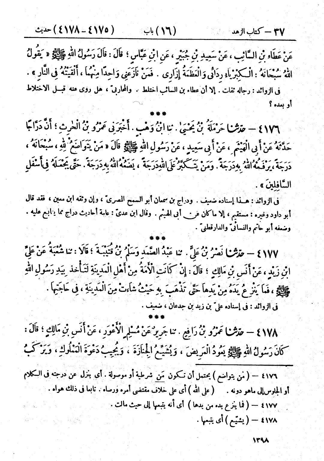 4176 - حَدَّثَنَا حَرْمَلَةُ بْنُ يَحْيَى قَالَ: حَدَّثَنَا ابْنُ وَهْبٍ قَالَ: أَخْبَرَنِي عَمْرُو بْنُ الْحَارِثِ، أَنَّ دَرَّاجًا حَدَّثَهُ، عَنْ أَبِي الْهَيْثَمِ، عَنْ أَبِي سَعِيدٍ، عَنْ رَسُولِ اللَّهِ صَلَّى اللهُ عَلَيْهِ وَسَلَّمَ، قَالَ: «§مَنْ يَتَوَاضَعُ لِلَّهِ دَرَجَةً، يَرْفَعُهُ اللَّهُ بِهِ دَرَجَةً، وَمَنْ يَتَكَبَّرُ عَلَى اللَّهِ دَرَجَةً، يَضَعُهُ اللَّهُ بِهِ دَرَجَةً، حَتَّى يَجْعَلَهُ فِي أَسْفَلِ السَّافِلِينَ»