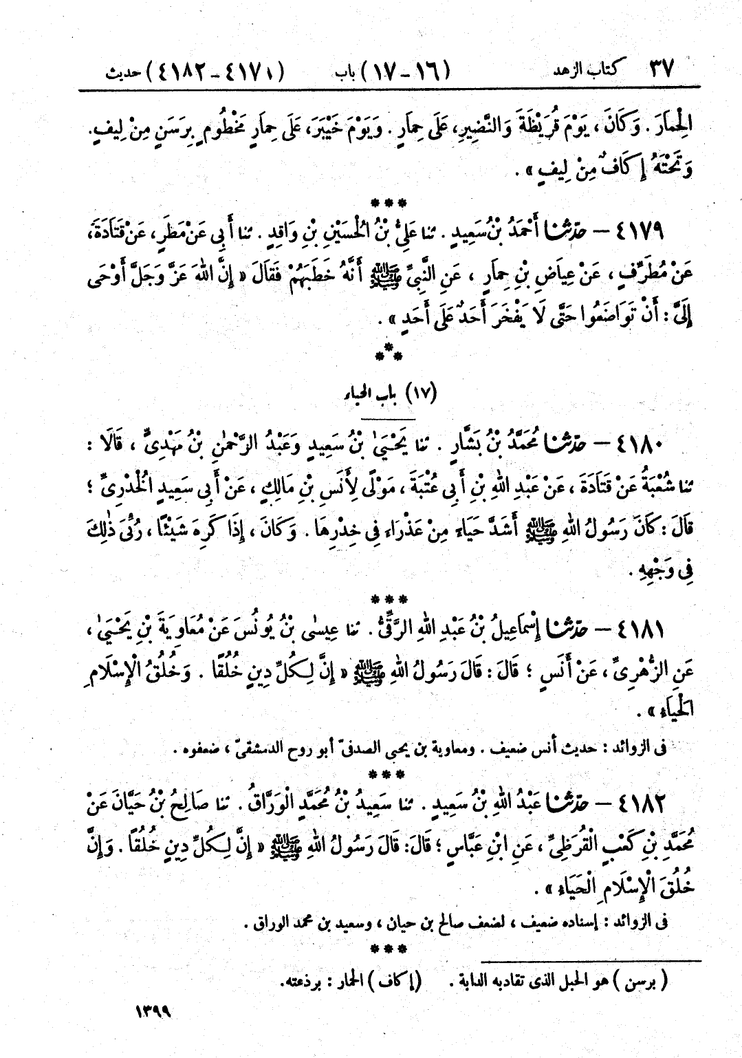 4182 - حَدَّثَنَا عَبْدُ اللَّهِ بْنُ سَعِيدٍ قَالَ: حَدَّثَنَا سَعِيدُ بْنُ مُحَمَّدٍ الْوَرَّاقُ قَالَ: حَدَّثَنَا صَالِحُ بْنُ حَسَّانَ، عَنْ مُحَمَّدِ بْنِ كَعْبٍ الْقُرَظِيِّ، عَنِ ابْنِ عَبَّاسٍ، قَالَ: قَالَ رَسُولُ اللَّهِ صَلَّى اللهُ عَلَيْهِ وَسَلَّمَ: «إِنَّ §لِكُلِّ دِينٍ خُلُقًا، وَإِنَّ خُلُقَ الْإِسْلَامِ الْحَيَاءُ»