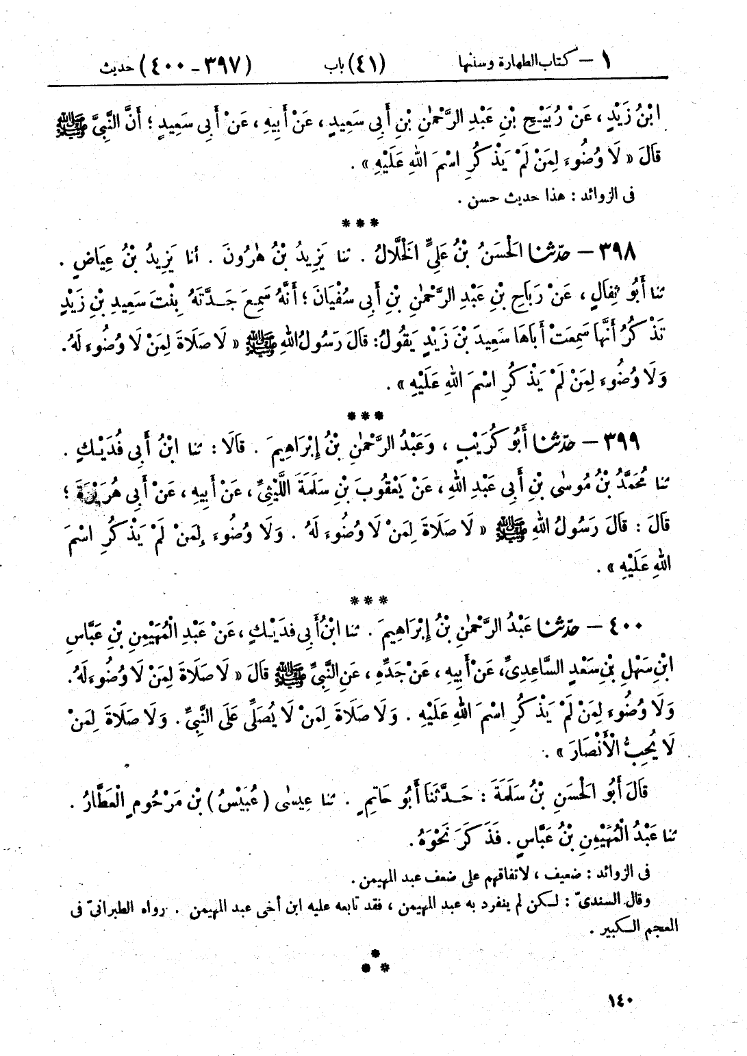 400 - حَدَّثَنَا عَبْدُ الرَّحْمَنِ بْنُ إِبْرَاهِيمَ قَالَ: حَدَّثَنَا ابْنُ أَبِي فُدَيْكٍ، عَنْ عَبْدِ الْمُهَيْمِنِ بْنِ عَبَّاسِ بْنِ سَهْلِ بْنِ سَعْدٍ السَّاعِدِيِّ، عَنْ أَبِيهِ، عَنْ جَدِّهِ، عَنِ النَّبِيِّ صَلَّى اللهُ عَلَيْهِ وَسَلَّمَ قَالَ: «§لَا صَلَاةَ لِمَنْ لَا وُضُوءَ لَهُ، وَلَا وُضُوءَ لِمَنْ لَمْ يَذْكُرِ اسْمَ اللَّهِ عَلَيْهِ، وَلَا صَلَاةَ لِمَنْ لَا يُصَلِّي عَلَى النَّبِيِّ، وَلَا صَلَاةَ لِمَنْ لَا يُحِبُّ الْأَنْصَارَ» قَالَ أَبُو الْحَسَنِ بْنُ سَلَمَةَ، حَدَّثَنَا أَبُو حَاتِمٍ قَالَ: حَدَّثَنَا عِيسَى _ عُبَيْسُ _ بْنُ مَرْحُومٍ الْعَطَّارُ قَالَ: حَدَّثَنَا عَبْدُ الْمُهَيْمِنِ بْنُ عَبَّاسٍ فَذَكَرَ نَحْوَهُ