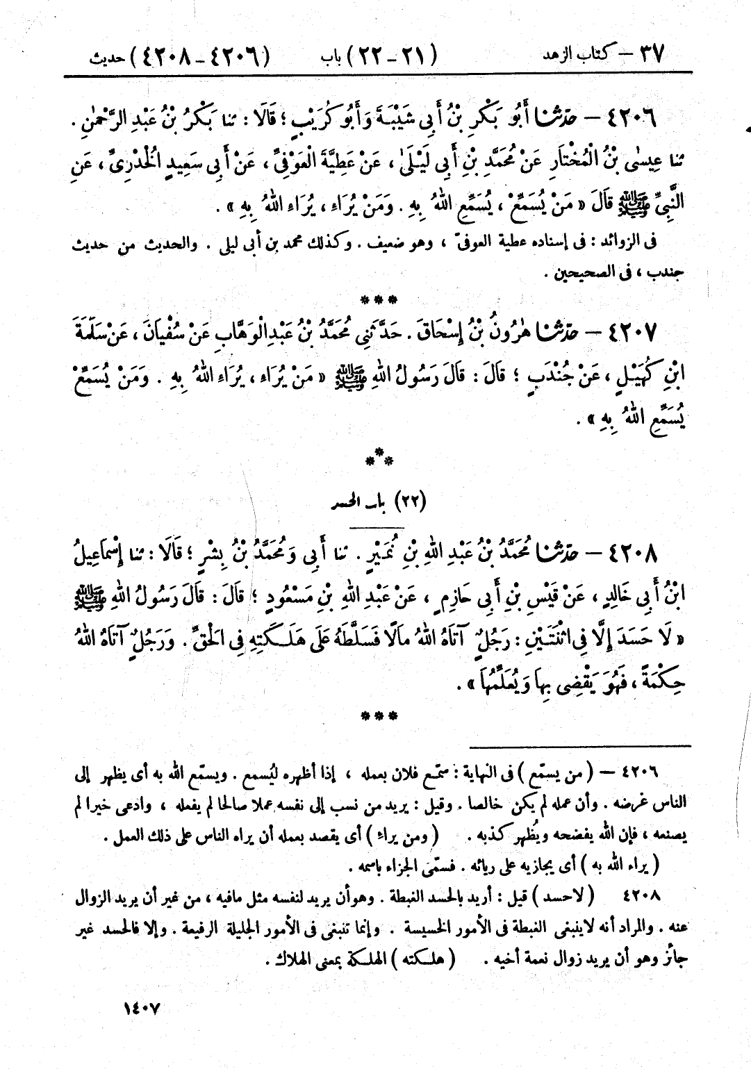 4206 - حَدَّثَنَا أَبُو بَكْرِ بْنُ أَبِي شَيْبَةَ، وَأَبُو كُرَيْبٍ، قَالَا: حَدَّثَنَا بَكْرُ بْنُ عَبْدِ الرَّحْمَنِ قَالَ: حَدَّثَنَا عِيسَى بْنُ الْمُخْتَارِ، عَنْ مُحَمَّدِ بْنِ أَبِي لَيْلَى، عَنْ عَطِيَّةَ الْعَوْفِيِّ، عَنْ أَبِي سَعِيدٍ الْخُدْرِيِّ، عَنِ النَّبِيِّ صَلَّى اللهُ عَلَيْهِ وَسَلَّمَ، قَالَ: «§مَنْ يُسَمِّعْ يُسَمِّعِ اللَّهُ بِهِ، وَمَنْ يُرَاءِ يُرَاءِ اللَّهُ بِهِ»