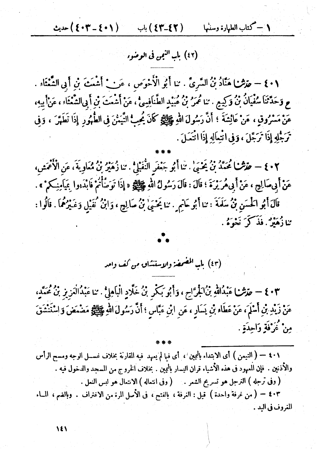 401 - حَدَّثَنَا هَنَّادُ بْنُ السَّرِيِّ قَالَ: حَدَّثَنَا أَبُو الْأَحْوَصِ، عَنْ أَشْعَثَ بْنِ أَبِي الشَّعْثَاءِ، ح، وحَدَّثَنَا سُفْيَانُ بْنُ وَكِيعٍ قَالَ: حَدَّثَنَا عُمَرُ بْنُ عُبَيْدٍ الطَّنَافِسِيُّ، عَنْ أَشْعَثَ بْنِ أَبِي الشَّعْثَاءِ، عَنْ أَبِيهِ، عَنْ مَسْرُوقٍ، عَنْ عَائِشَةَ، «أَنَّ رَسُولَ اللَّهِ صَلَّى اللهُ عَلَيْهِ وَسَلَّمَ كَانَ §يُحِبُّ التَّيَمُّنَ فِي الطُّهُورِ إِذَا تَطَهَّرَ، وَفِي تَرَجُّلِهِ إِذَا تَرَجَّلَ، وَفِي انْتِعَالِهِ إِذَا انْتَعَلَ»