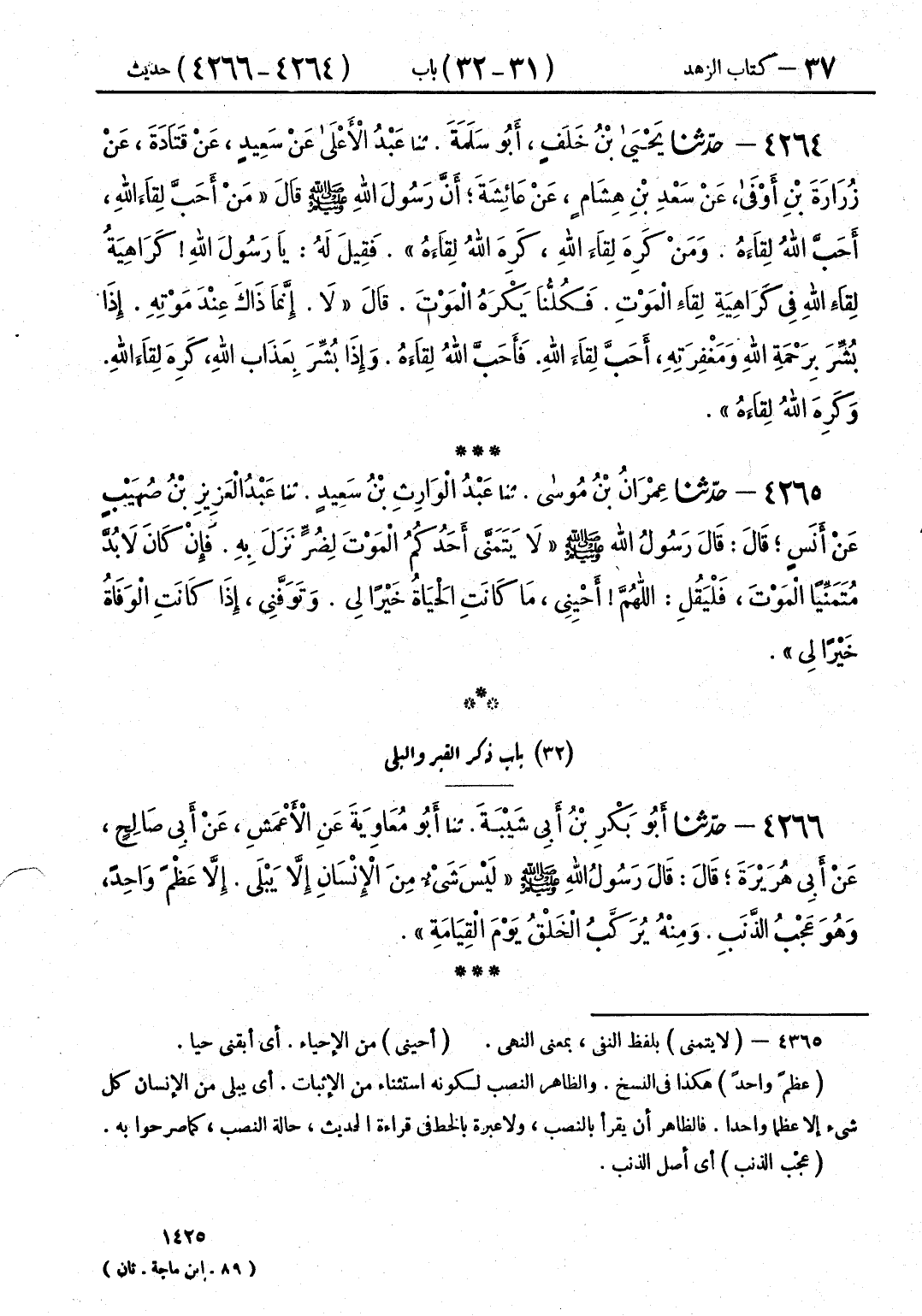 S [ش - (لا يتمنى) بلفظ النفي بمعنى النهي. (أحيني) من الإحياء. أي أبقني حيا. (عظم احد) هكذا في لنسخ. والظاهؤ النصب لكونه ستثناء من الإثبات. أي يبلى من الإنسان كل شيء إلا عظما واحدا. فالظاهر أن يقرأ بالنصب ولاعبرة بالخط في قراءة الحديث حالة النصب كما صرحوا به. (عجب الذنب) أي أصل الذنب.]