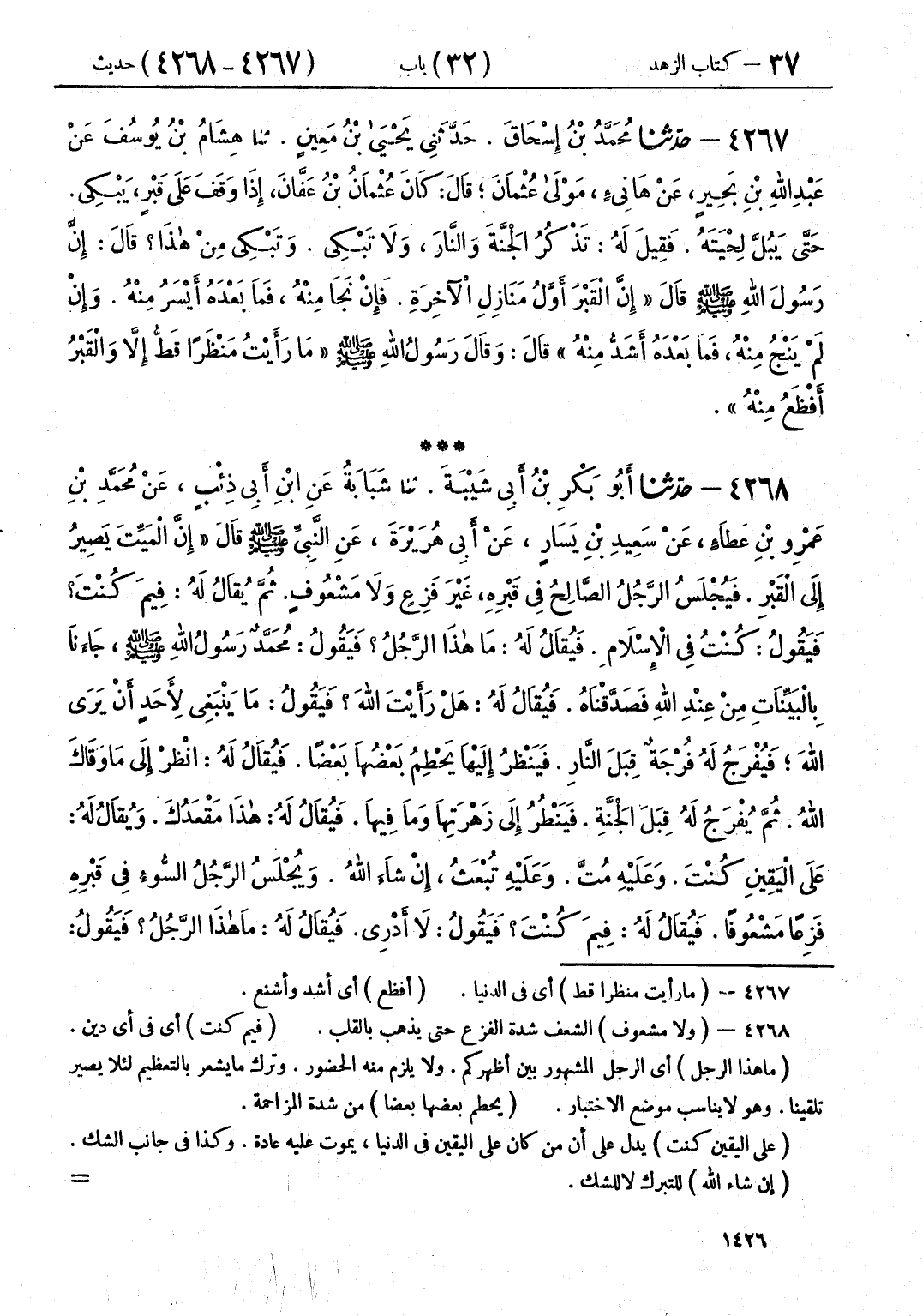4267 - حَدَّثَنَا مُحَمَّدُ بْنُ إِسْحَاقَ قَالَ: حَدَّثَنِي يَحْيَى بْنُ مَعِينٍ قَالَ: حَدَّثَنَا هِشَامُ بْنُ يُوسُفَ، عَنْ عَبْدِ اللَّهِ بْنِ بَحِيرٍ، عَنْ هَانِئٍ، مَوْلَى عُثْمَانَ، قَالَ: كَانَ عُثْمَانُ بْنُ عَفَّانَ إِذَا وَقَفَ عَلَى قَبْرٍ يَبْكِي حَتَّى يَبُلَّ لِحْيَتَهُ، فَقِيلَ لَهُ: تَذْكُرُ الْجَنَّةَ وَالنَّارَ، وَلَا تَبْكِي، وَتَبْكِي مِنْ هَذَا؟ قَالَ: إِنَّ رَسُولَ اللَّهِ صَلَّى اللهُ عَلَيْهِ وَسَلَّمَ، قَالَ: «إِنَّ §الْقَبْرَ أَوَّلُ مَنَازِلِ الْآخِرَةِ، فَإِنْ نَجَا مِنْهُ، فَمَا بَعْدَهُ أَيْسَرُ مِنْهُ، وَإِنْ لَمْ يَنْجُ مِنْهُ، فَمَا بَعْدَهُ أَشَدُّ مِنْهُ» قَالَ: وَقَالَ رَسُولُ اللَّهِ صَلَّى اللهُ عَلَيْهِ وَسَلَّمَ: «مَا رَأَيْتُ مَنْظَرًا قَطُّ إِلَّا وَالْقَبْرُ أَفْظَعُ مِنْهُ»