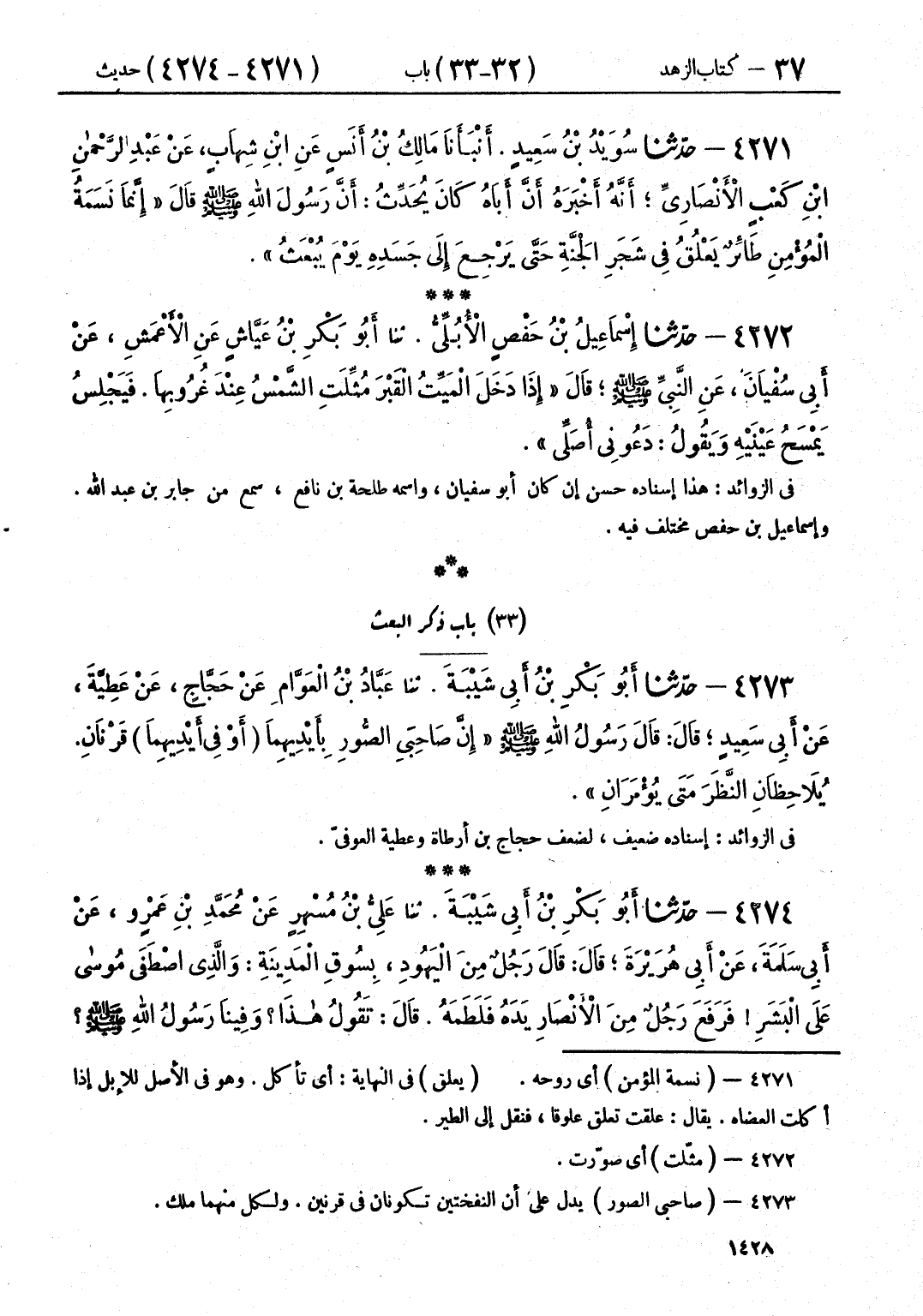 4273 - حَدَّثَنَا أَبُو بَكْرِ بْنُ أَبِي شَيْبَةَ قَالَ: حَدَّثَنَا عَبَّادُ بْنُ الْعَوَّامِ، عَنْ حَجَّاجٍ، عَنْ عَطِيَّةَ، عَنْ أَبِي سَعِيدٍ، قَالَ: قَالَ رَسُولُ اللَّهِ صَلَّى اللهُ عَلَيْهِ وَسَلَّمَ: «إِنَّ §صَاحِبَيِ الصُّورِ بِأَيْدِيهِمَا، أَوْ فِي أَيْدِيهِمَا قَرْنَانِ، يُلَاحِظَانِ النَّظَرَ مَتَى يُؤْمَرَانِ»