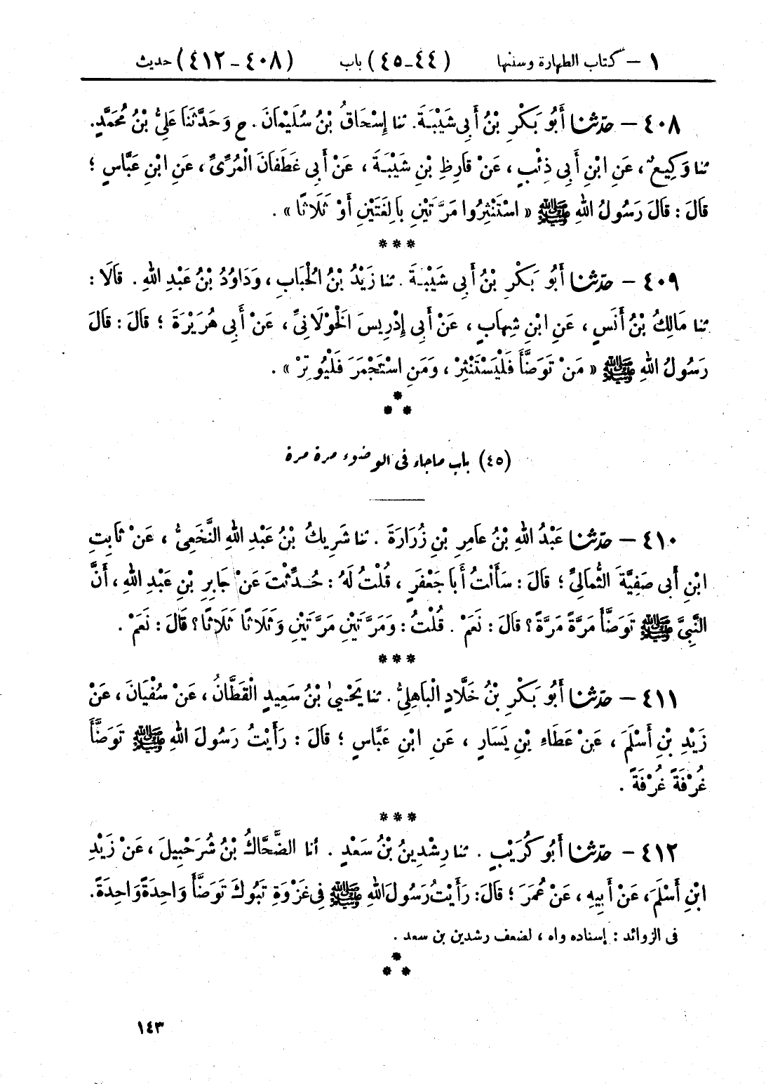 412 - حَدَّثَنَا أَبُو كُرَيْبٍ قَالَ: حَدَّثَنَا رِشْدِينُ بْنُ سَعْدٍ قَالَ: أَخْبَرَنَا الضَّحَّاكُ بْنُ شُرَحْبِيلَ، عَنْ زَيْدِ بْنِ أَسْلَمَ، عَنْ أَبِيهِ، عَنْ عُمَرَ قَالَ: «رَأَيْتُ رَسُولَ اللَّهِ صَلَّى اللهُ عَلَيْهِ وَسَلَّمَ فِي غَزْوَةِ تَبُوكَ §تَوَضَّأَ وَاحِدَةً وَاحِدَةً»
