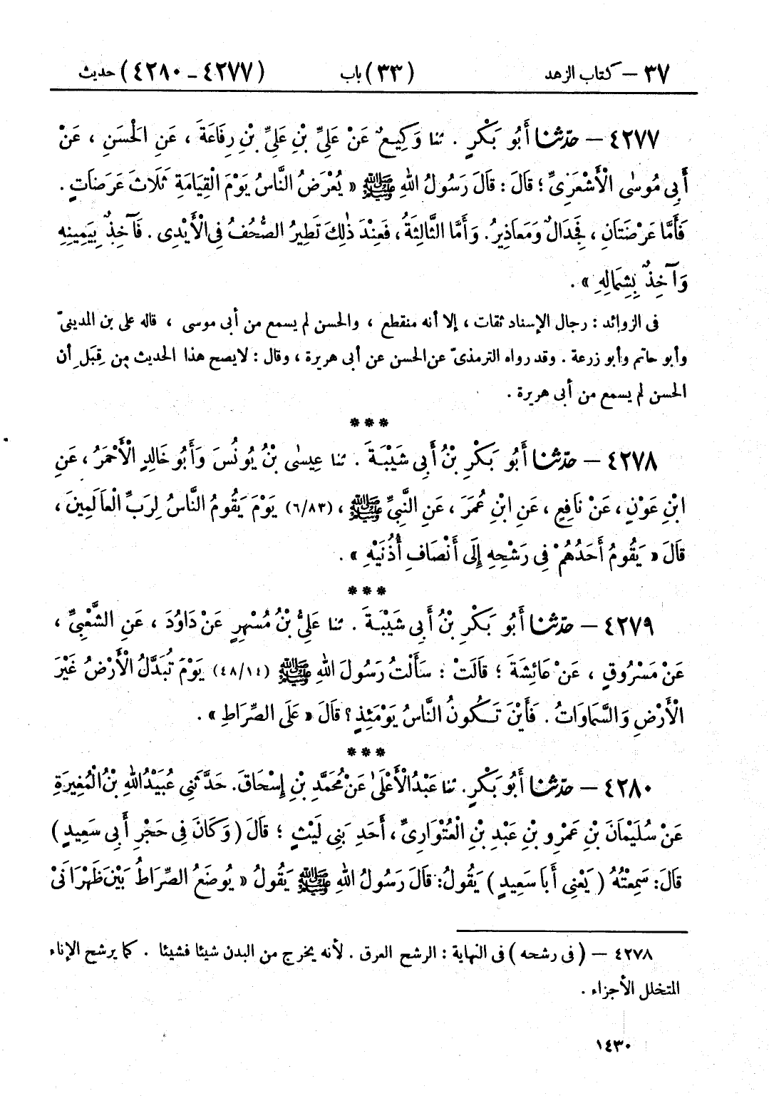 4277 - حَدَّثَنَا أَبُو بَكْرٍ، قَالَ: حَدَّثَنَا وَكِيعٌ، عَنْ عَلِيِّ بْنِ عَلِيِّ بْنِ رِفَاعَةَ، عَنِ الْحَسَنِ، عَنْ أَبِي مُوسَى الْأَشْعَرِيِّ، قَالَ: قَالَ رَسُولُ اللَّهِ صَلَّى اللهُ عَلَيْهِ وَسَلَّمَ: " §يُعْرَضُ النَّاسُ يَوْمَ الْقِيَامَةِ ثَلَاثَ عَرَضَاتٍ: فَأَمَّا عَرْضَتَانِ، فَجِدَالٌ، وَمَعَاذِيرُ، وَأَمَّا الثَّالِثَةُ، فَعِنْدَ ذَلِكَ تَطِيرُ الصُّحُفُ فِي الْأَيْدِي، فَآخِذٌ بِيَمِينِهِ، وَآخِذٌ بِشِمَالِهِ "