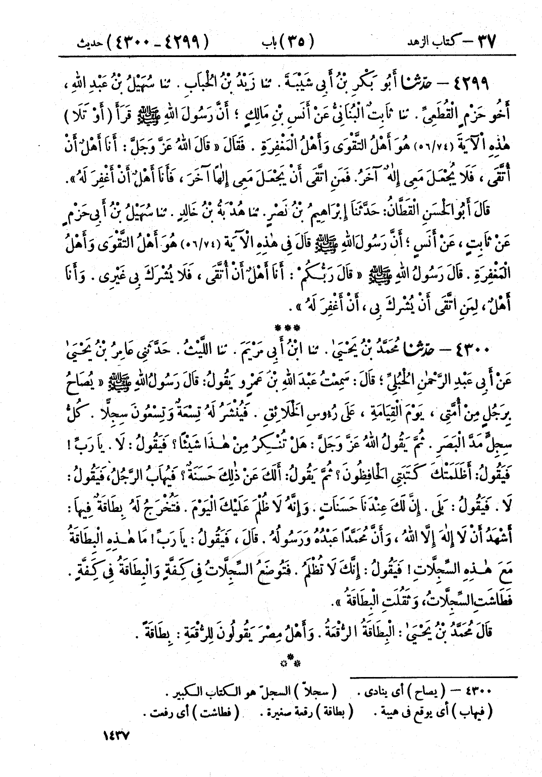 4300 - حَدَّثَنَا مُحَمَّدُ بْنُ يَحْيَى قَالَ: حَدَّثَنَا ابْنُ أَبِي مَرْيَمَ قَالَ: حَدَّثَنِي اللَّيْثُ قَالَ: حَدَّثَنِي عَامِرُ بْنُ يَحْيَى، عَنْ أَبِي عَبْدِ الرَّحْمَنِ الْحُبُلِيِّ، قَالَ: سَمِعْتُ عَبْدَ اللَّهِ بْنَ عَمْرٍو، يَقُولُ: قَالَ رَسُولُ اللَّهِ صَلَّى اللهُ عَلَيْهِ وَسَلَّمَ: " يُصَاحُ بِرَجُلٍ مِنْ أُمَّتِي يَوْمَ الْقِيَامَةِ عَلَى رُءُوسِ الْخَلَائِقِ، فَيُنْشَرُ لَهُ تِسْعَةٌ وَتِسْعُونَ سِجِلًّا، كُلُّ سِجِلٍّ مَدَّ الْبَصَرِ، ثُمَّ يَقُولُ اللَّهُ عَزَّ وَجَلَّ: §هَلْ تُنْكِرُ مِنْ هَذَا شَيْئًا؟ فَيَقُولُ: لَا، يَا رَبِّ، فَيَقُولُ: أَظَلَمَتْكَ كَتَبَتِي الْحَافِظُونَ؟ فَيَقُولُ: لَا، ثُمَّ يَقُولُ: أَلَكَ عُذْرٌ، أَلَكَ حَسَنَةٌ؟ فَيُهَابُ الرَّجُلُ، فَيَقُولُ: لَا، فَيَقُولُ: بَلَى، إِنَّ لَكَ عِنْدَنَا حَسَنَاتٍ، وَإِنَّهُ لَا ظُلْمَ عَلَيْكَ الْيَوْمَ، فَتُخْرَجُ لَهُ بِطَاقَةٌ فِيهَا: أَشْهَدُ أَنْ لَا إِلَهَ إِلَّا اللَّهُ، وَأَنَّ مُحَمَّدًا عَبْدُهُ وَرَسُولُهُ، قَالَ: فَيَقُولُ: يَا رَبِّ مَا هَذِهِ الْبِطَاقَةُ، مَعَ هَذِهِ السِّجِلَّاتِ؟ فَيَقُولُ: إِنَّكَ لَا تُظْلَمُ، فَتُوضَعُ السِّجِلَّاتُ فِي كِفَّةٍ، وَالْبِطَاقَةُ فِي كِفَّةٍ، فَطَاشَتِ السِّجِلَّاتُ، وَثَقُلَتِ الْبِطَاقَةُ قَالَ مُحَمَّدُ بْنُ يَحْيَى: " الْبِطَاقَةُ: الرُّقْعَةُ، وَأَهْلُ مِصْرَ يَقُولُونَ لِلرُّقْعَةِ: بِطَاقَةً "