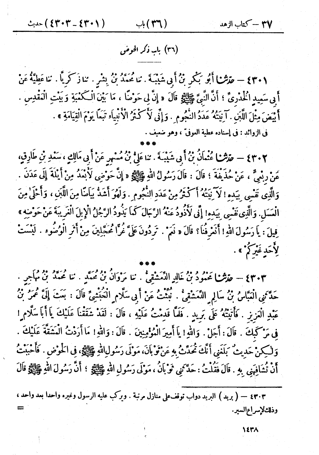 4301 - حَدَّثَنَا أَبُو بَكْرِ بْنُ أَبِي شَيْبَةَ قَالَ: حَدَّثَنَا مُحَمَّدُ بْنُ بِشْرٍ قَالَ: حَدَّثَنَا زَكَرِيَّا قَالَ: حَدَّثَنَا عَطِيَّةُ، عَنْ أَبِي سَعِيدٍ الْخُدْرِيِّ، أَنَّ النَّبِيَّ صَلَّى اللهُ عَلَيْهِ وَسَلَّمَ، قَالَ: «§إِنَّ لِي حَوْضًا مَا بَيْنَ الْكَعْبَةِ، وَبَيْتِ الْمَقْدِسِ أَبْيَضَ، مِثْلَ اللَّبَنِ، آنِيَتُهُ عَدَدُ النُّجُومِ، وَإِنِّي لَأَكْثَرُ الْأَنْبِيَاءِ تَبَعًا يَوْمَ الْقِيَامَةِ»