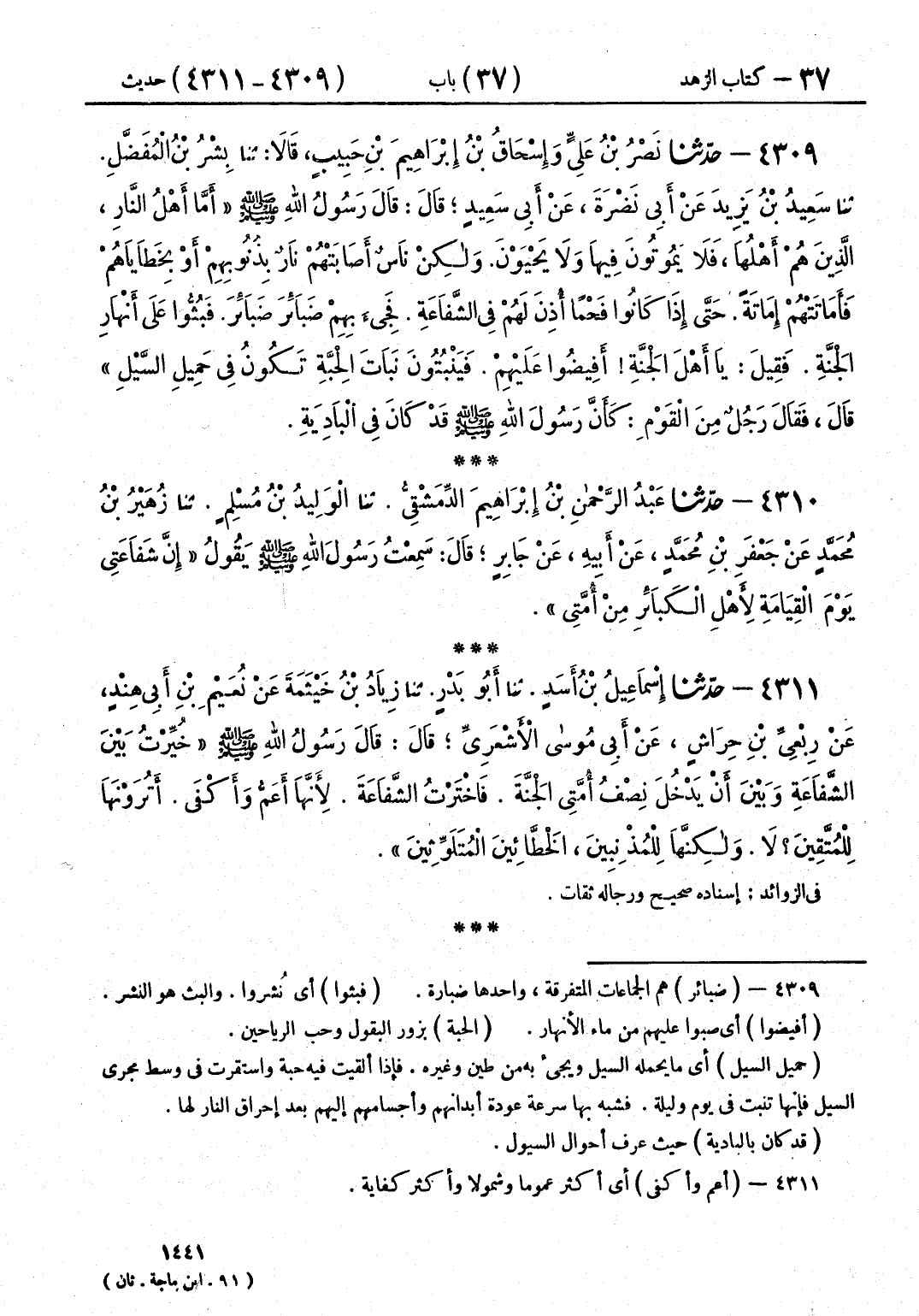 4309 - حَدَّثَنَا نَصْرُ بْنُ عَلِيٍّ، وَإِسْحَاقُ بْنُ إِبْرَاهِيمَ بْنِ حَبِيبٍ قَالَا: حَدَّثَنَا بِشْرُ بْنُ الْمُفَضَّلِ قَالَ: حَدَّثَنَا سَعِيدُ بْنُ يَزِيدَ، عَنْ أَبِي نَضْرَةَ، عَنْ أَبِي سَعِيدٍ قَالَ: قَالَ رَسُولُ اللَّهِ صَلَّى اللهُ عَلَيْهِ وَسَلَّمَ: " §أَمَّا أَهْلُ النَّارِ، الَّذِينَ هُمْ أَهْلُهَا، فَلَا يَمُوتُونَ فِيهَا، وَلَا يَحْيَوْنَ، وَلَكِنْ نَاسٌ أَصَابَتْهُمْ نَارٌ بِذُنُوبِهِمْ، أَوْ بِخَطَايَاهُمْ، فَأَمَاتَتْهُمْ إِمَاتَةً، حَتَّى إِذَا كَانُوا فَحْمًا أُذِنَ لَهُمْ فِي الشَّفَاعَةِ، فَجِيءَ بِهِمْ ضَبَائِرَ ضَبَائِرَ، فَبُثُّوا عَلَى أَنْهَارِ الْجَنَّةِ، فَقِيلَ: يَا أَهْلَ الْجَنَّةِ أَفِيضُوا عَلَيْهِمْ، فَيَنْبُتُونَ نَبَاتَ الْحِبَّةِ تَكُونُ فِي حَمِيلِ السَّيْلِ "، قَالَ: فَقَالَ رَجُلٌ مِنَ الْقَوْمِ: كَأَنَّ رَسُولَ اللَّهِ صَلَّى اللهُ عَلَيْهِ وَسَلَّمَ، قَدْ كَانَ فِي الْبَادِيَةِ