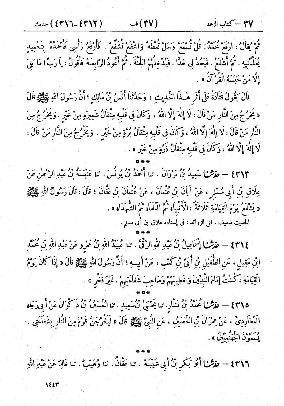 4313 - حَدَّثَنَا سَعِيدُ بْنُ مَرْوَانَ قَالَ: حَدَّثَنَا أَحْمَدُ بْنُ يُونُسَ قَالَ: حَدَّثَنَا عَنْبَسَةُ بْنُ عَبْدِ الرَّحْمَنِ، عَنْ عَلَّاقِ بْنِ أَبِي مُسْلِمٍ، عَنْ أَبَانَ بْنِ عُثْمَانَ، عَنْ عُثْمَانَ بْنِ عَفَّانَ، قَالَ: قَالَ رَسُولُ اللَّهِ صَلَّى اللهُ عَلَيْهِ وَسَلَّمَ: " §يَشْفَعُ يَوْمَ الْقِيَامَةِ ثَلَاثَةٌ: الْأَنْبِيَاءُ، ثُمَّ الْعُلَمَاءُ، ثُمَّ الشُّهَدَاءُ "