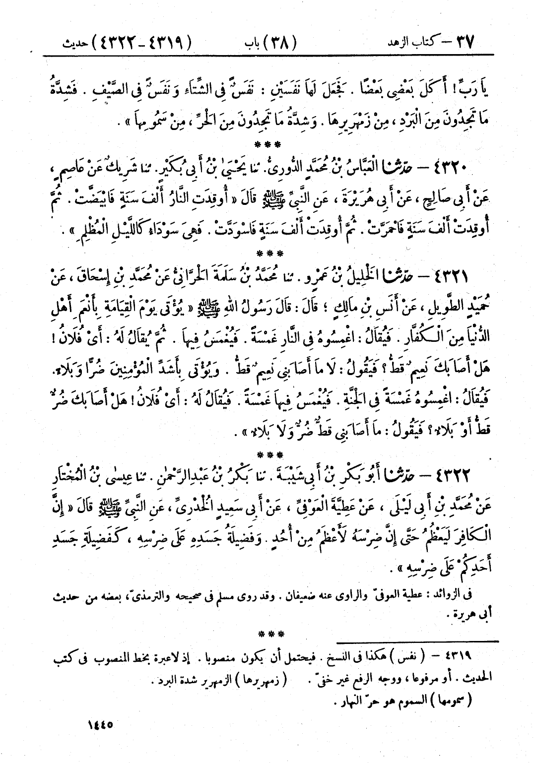 4320 - حَدَّثَنَا الْعَبَّاسُ بْنُ مُحَمَّدٍ الدُّورِيُّ قَالَ: حَدَّثَنَا يَحْيَى بْنُ أَبِي بُكَيْرٍ قَالَ: حَدَّثَنَا شَرِيكٌ، عَنْ عَاصِمٍ، عَنْ أَبِي صَالِحٍ، عَنْ أَبِي هُرَيْرَةَ، عَنِ النَّبِيِّ صَلَّى اللهُ عَلَيْهِ وَسَلَّمَ، قَالَ:: «§أُوقِدَتِ النَّارُ أَلْفَ سَنَةٍ فَابْيَضَّتْ، ثُمَّ أُوقِدَتْ أَلْفَ سَنَةٍ فَاحْمَرَّتْ، ثُمَّ أُوقِدَتْ أَلْفَ سَنَةٍ فَاسْوَدَّتْ، فَهِيَ سَوْدَاءُ كَاللَّيْلِ الْمُظْلِمِ»