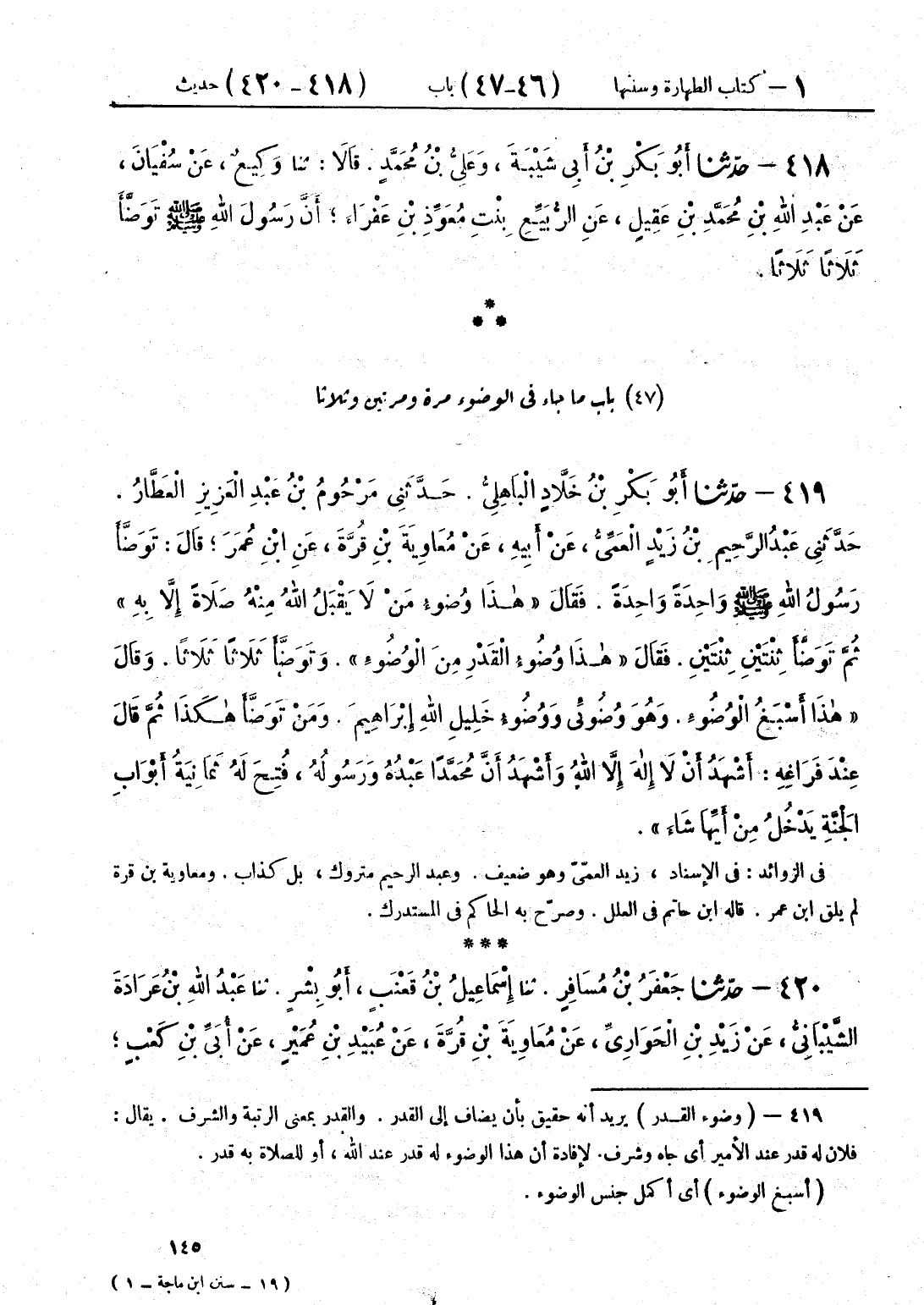 420 - حَدَّثَنَا جَعْفَرُ بْنُ مُسَافِرٍ قَالَ: حَدَّثَنَا إِسْمَاعِيلُ بْنُ قَعْنَبٍ أَبُو بِشْرٍ قَالَ: حَدَّثَنَا عَبْدُ اللَّهِ بْنُ عَرَادَةَ الشَّيْبَانِيُّ، عَنْ زَيْدِ بْنِ الْحَوَارِيِّ، عَنْ مُعَاوِيَةَ بْنِ قُرَّةَ، عَنْ عُبَيْدِ بْنِ عُمَيْرٍ، عَنْ أُبَيِّ بْنِ كَعْبٍ أَنَّ رَسُولَ اللَّهِ صَلَّى اللهُ عَلَيْهِ وَسَلَّمَ دَعَا بِمَاءٍ، فَتَوَضَّأَ مَرَّةً مَرَّةً، فَقَالَ: «هَذَا وَظِيفَةُ الْوُضُوءِ» أَوْ قَالَ " §وُضُوءٌ مَنْ لَمْ يَتَوَضَّأْهُ، لَمْ يَقْبَلِ اللَّهُ لَهُ صَلَاةً، ثُمَّ تَوَضَّأَ مَرَّتَيْنِ مَرَّتَيْنِ، ثُمَّ قَالَ: «هَذَا وُضُوءٌ مَنْ تَوَضَّأَهُ، أَعْطَاهُ اللَّهُ كِفْلَيْنِ مِنَ الْأَجْرِ» ، ثُمَّ تَوَضَّأَ ثَلَاثًا ثَلَاثًا، فَقَالَ: «هَذَا وُضُوئِي، وَوُضُوءُ الْمُرْسَلِينَ مِنْ قَبْلِي»