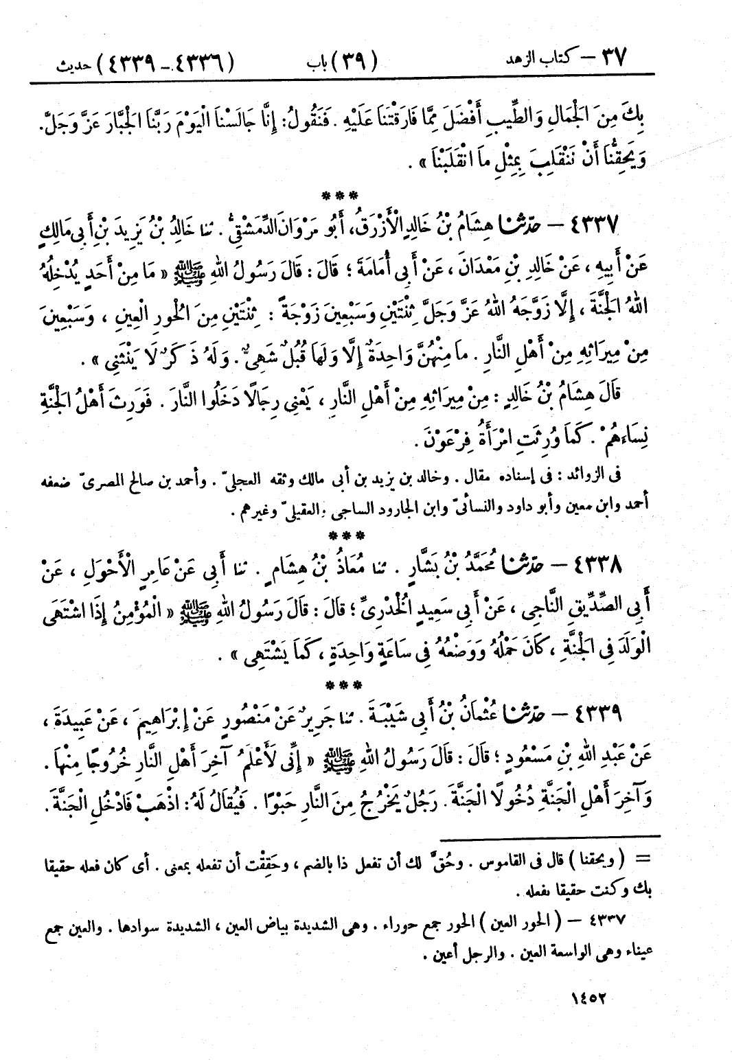 4337 - حَدَّثَنَا هِشَامُ بْنُ خَالِدٍ الْأَزْرَقُ أَبُو مَرْوَانَ الدِّمَشْقِيُّ قَالَ: حَدَّثَنَا خَالِدُ بْنُ يَزِيدَ بْنِ أَبِي مَالِكٍ، عَنْ أَبِيهِ، عَنْ خَالِدِ بْنِ مَعْدَانَ، عَنْ أَبِي أُمَامَةَ، قَالَ: قَالَ رَسُولُ اللَّهِ صَلَّى اللهُ عَلَيْهِ وَسَلَّمَ: «§مَا مِنْ أَحَدٍ يُدْخِلُهُ اللَّهُ الْجَنَّةَ، إِلَّا زَوَّجَهُ اللَّهُ عَزَّ وَجَلَّ ثِنْتَيْنِ وَسَبْعِينَ زَوْجَةً، ثِنْتَيْنِ مِنَ الْحُورِ الْعِينِ، وَسَبْعِينَ مِنْ مِيرَاثِهِ مِنْ أَهْلِ النَّارِ، مَا مِنْهُنَّ وَاحِدَةٌ إِلَّا وَلَهَا قُبُلٌ شَهِيٌّ، وَلَهُ ذَكَرٌ لَا يَنْثَنِي» قَالَ هِشَامُ بْنُ خَالِدٍ: " مِنْ مِيرَاثِهِ مِنْ أَهْلِ النَّارِ، يَعْنِي رِجَالًا دَخَلُوا النَّارَ، فَوَرِثَ أَهْلُ الْجَنَّةِ نِسَاءَهُمْ، كَمَا وُرِثَتِ امْرَأَةُ فِرْعَوْنَ