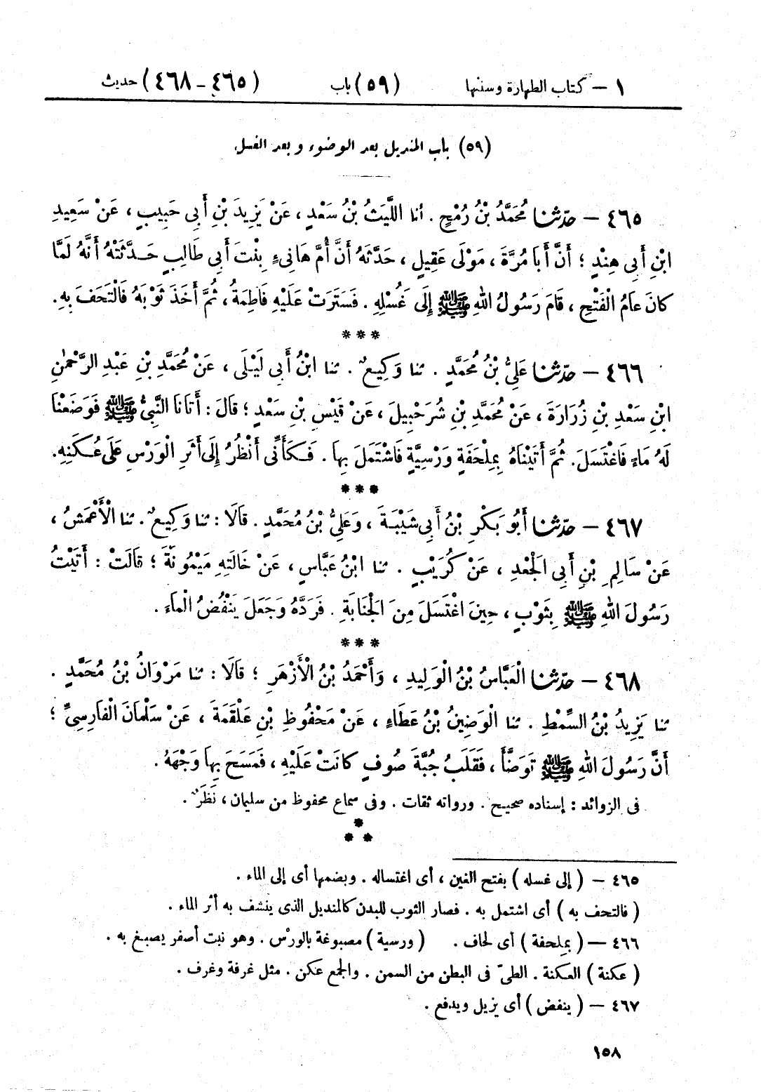 468 - حَدَّثَنَا الْعَبَّاسُ بْنُ الْوَلِيدِ وَأَحْمَدُ بْنُ الْأَزْهَرِ، قَالَا: حَدَّثَنَا مَرْوَانُ بْنُ مُحَمَّدٍ قَالَ: حَدَّثَنَا يَزِيدُ بْنُ السِّمْطِ قَالَ: حَدَّثَنَا الْوَضِينُ بْنُ عَطَاءٍ، عَنْ مَحْفُوظِ بْنِ عَلْقَمَةَ، عَنْ سَلْمَانَ الْفَارِسِيِّ، أَنَّ رَسُولَ اللَّهِ صَلَّى اللهُ عَلَيْهِ وَسَلَّمَ «§تَوَضَّأَ، فَقَلَبَ جُبَّةَ صُوفٍ كَانَتْ عَلَيْهِ، فَمَسَحَ بِهَا وَجْهَهُ»