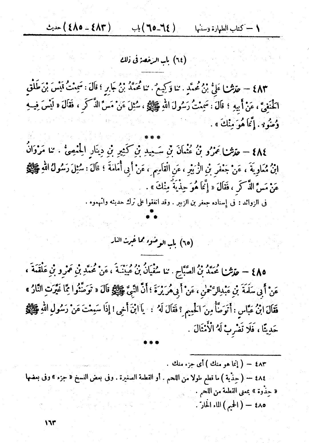 485 - حَدَّثَنَا مُحَمَّدُ بْنُ الصَّبَّاحِ قَالَ: حَدَّثَنَا سُفْيَانُ بْنُ عُيَيْنَةَ، عَنْ مُحَمَّدِ بْنِ عَمْرِو بْنِ عَلْقَمَةَ، عَنْ أَبِي سَلَمَةَ بْنِ عَبْدِ الرَّحْمَنِ، عَنْ أَبِي هُرَيْرَةَ أَنَّ النَّبِيَّ صَلَّى اللهُ عَلَيْهِ وَسَلَّمَ قَالَ: «§تَوَضَّئُوا مِمَّا غَيَّرَتِ النَّارُ» فَقَالَ ابْنُ عَبَّاسٍ: أَتَوَضَّأُ مِنَ الْحَمِيمِ؟ فَقَالَ لَهُ: يَا ابْنَ أَخِي، إِذَا سَمِعْتَ عَنْ رَسُولِ اللَّهِ صَلَّى اللهُ عَلَيْهِ وَسَلَّمَ حَدِيثًا، فَلَا تَضْرِبْ لَهُ الْأَمْثَالَ
