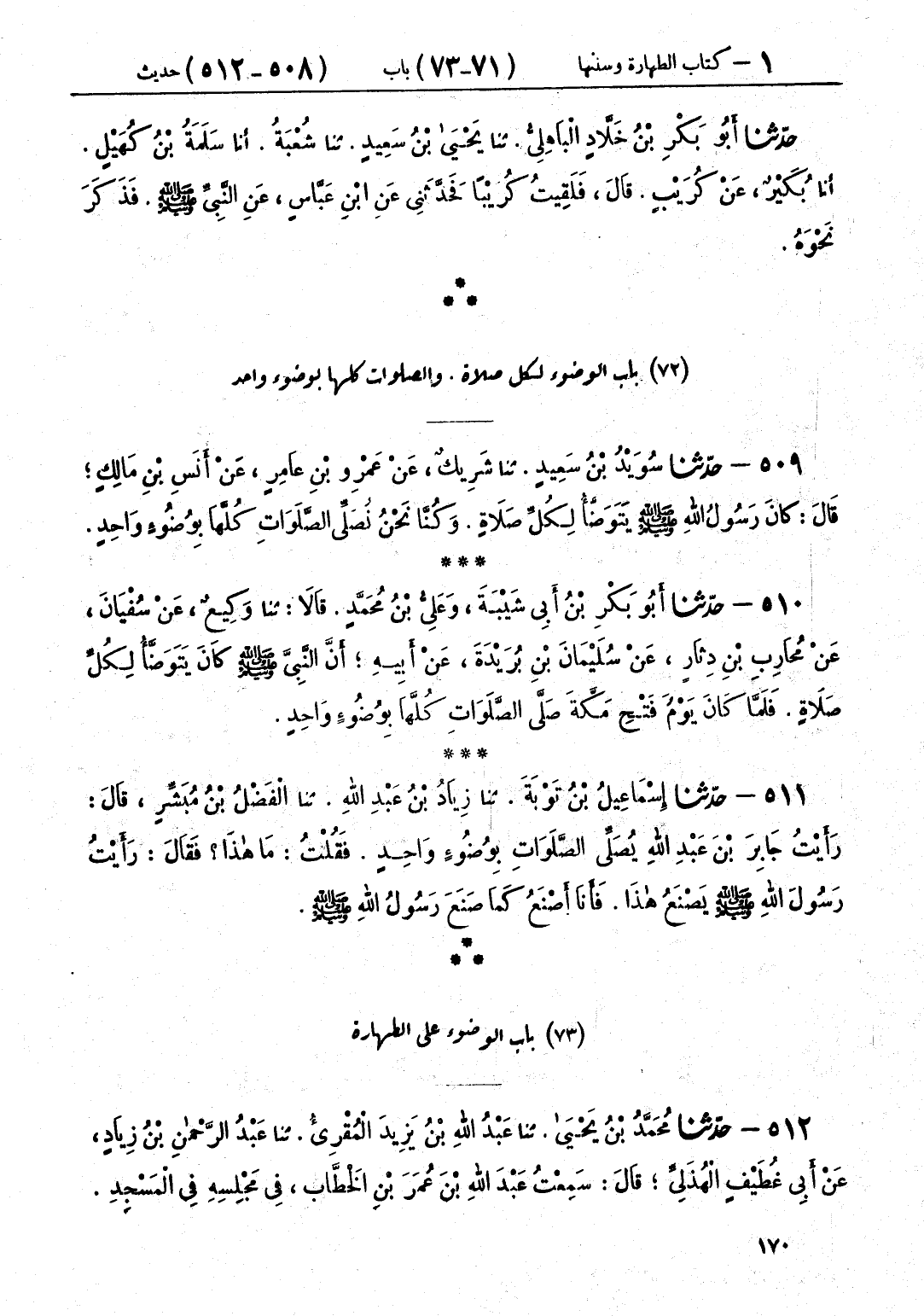 509 - حَدَّثَنَا سُوَيْدُ بْنُ سَعِيدٍ قَالَ: حَدَّثَنَا شَرِيكٌ، عَنْ عَمْرِو بْنِ عَامِرٍ، عَنْ أَنَسِ بْنِ مَالِكٍ قَالَ: كَانَ رَسُولُ اللَّهِ صَلَّى اللهُ عَلَيْهِ وَسَلَّمَ «§يَتَوَضَّأُ لِكُلِّ صَلَاةٍ، وَكُنَّا نَحْنُ نُصَلِّي الصَّلَوَاتِ كُلَّهَا بِوُضُوءٍ وَاحِدٍ»