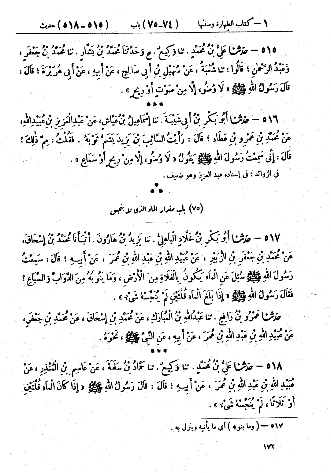 517 - حَدَّثَنَا أَبُو بَكْرِ بْنُ خَلَّادٍ الْبَاهِلِيُّ قَالَ: حَدَّثَنَا يَزِيدُ بْنُ هَارُونَ قَالَ: أَنْبَأَنَا مُحَمَّدُ بْنُ إِسْحَاقَ، عَنْ مُحَمَّدِ بْنِ جَعْفَرِ بْنِ الزُّبَيْرِ، عَنْ عُبَيْدِ اللَّهِ بْنِ عَبْدِ اللَّهِ بْنِ عُمَرَ، عَنْ أَبِيهِ، قَالَ: سَمِعْتُ رَسُولَ اللَّهِ صَلَّى اللهُ عَلَيْهِ وَسَلَّمَ، سُئِلَ عَنِ الْمَاءِ يَكُونُ بِالْفَلَاةِ مِنَ الْأَرْضِ، وَمَا يَنُوبُهُ مِنَ الدَّوَابِّ، وَالسِّبَاعِ، فَقَالَ رَسُولُ اللَّهِ صَلَّى اللهُ عَلَيْهِ وَسَلَّمَ: «§إِذَا بَلَغَ الْمَاءُ قُلَّتَيْنِ لَمْ يُنَجِّسْهُ شَيْءٌ» حَدَّثَنَا عَمْرُو بْنُ رَافِعٍ قَالَ: حَدَّثَنَا عَبْدُ اللَّهِ بْنُ الْمُبَارَكِ، عَنْ مُحَمَّدِ بْنِ إِسْحَاقَ، عَنْ مُحَمَّدِ بْنِ جَعْفَرٍ، عَنْ عُبَيْدِ اللَّهِ بْنِ عَبْدِ اللَّهِ بْنِ عُمَرَ، عَنْ أَبِيهِ، عَنِ النَّبِيِّ صَلَّى اللهُ عَلَيْهِ وَسَلَّمَ نَحْوَهُ