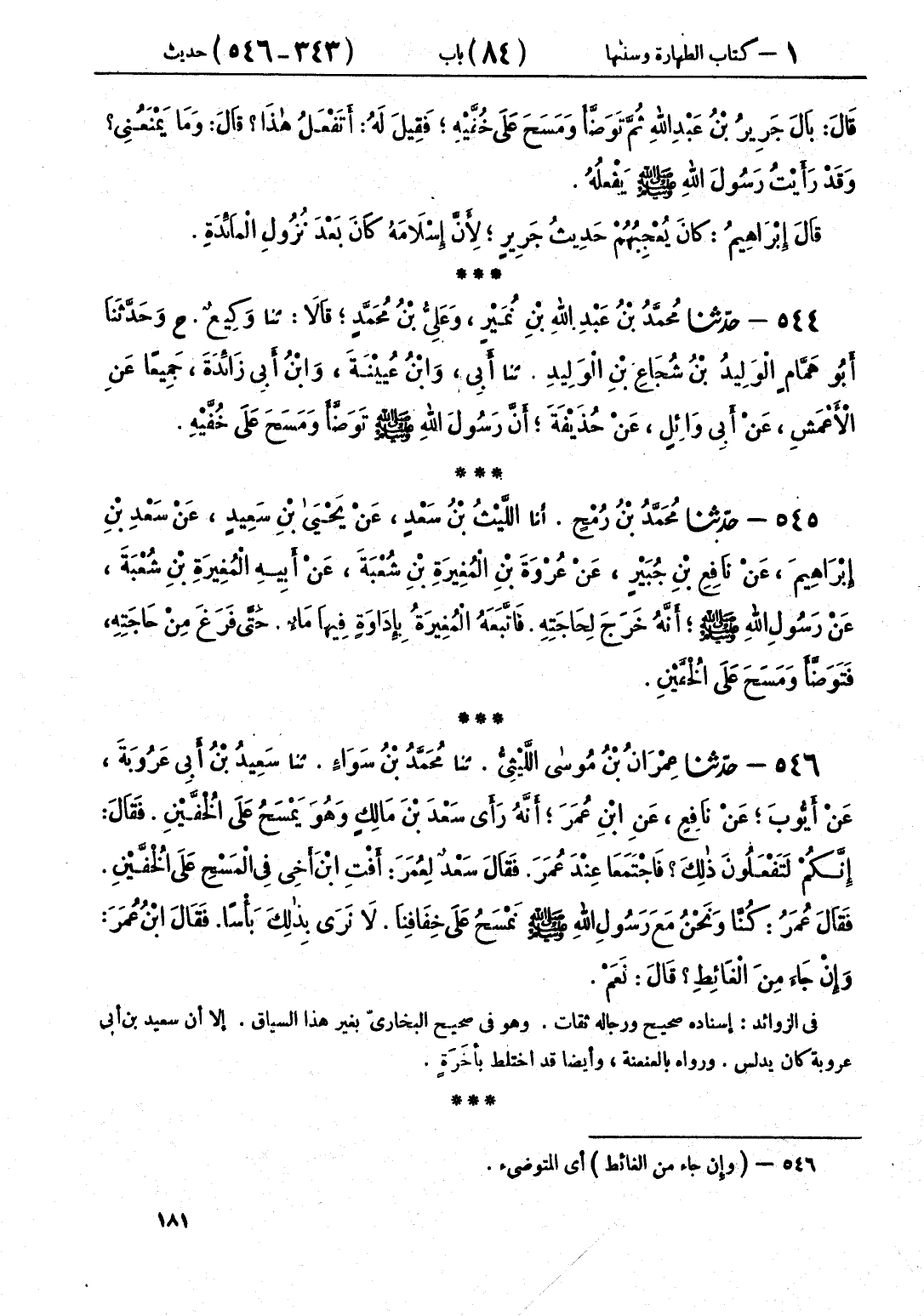 546 - حَدَّثَنَا عِمْرَانُ بْنُ مُوسَى اللَّيْثِيُّ قَالَ: حَدَّثَنَا مُحَمَّدُ بْنُ سَوَاءٍ قَالَ: حَدَّثَنَا سَعِيدُ بْنُ أَبِي عَرُوبَةَ، عَنْ أَيُّوبَ، عَنْ نَافِعٍ، عَنِ ابْنِ عُمَرَ، أَنَّهُ رَأَى سَعْدَ بْنَ مَالِكٍ وَهُوَ «يَمْسَحُ عَلَى الْخُفَّيْنِ» فَقَالَ: إِنَّكُمْ لَتَفْعَلُونَ ذَلِكَ، فَاجْتَمَعْنَا عِنْدَ عُمَرَ، فَقَالَ سَعْدٌ لِعُمَرَ أَفْتِ ابْنَ أَخِي فِي الْمَسْحِ عَلَى الْخُفَّيْنِ، فَقَالَ عُمَرُ كُنَّا وَنَحْنُ مَعَ رَسُولِ اللَّهِ صَلَّى اللهُ عَلَيْهِ وَسَلَّمَ «§نَمْسَحُ عَلَى خِفَافِنَا لَا نَرَى بِذَلِكَ بَأْسًا» فَقَالَ: ابْنُ عُمَرَ وَإِنْ جَاءَ مِنَ الْغَائِطِ؟ قَالَ: «نَعَمْ»