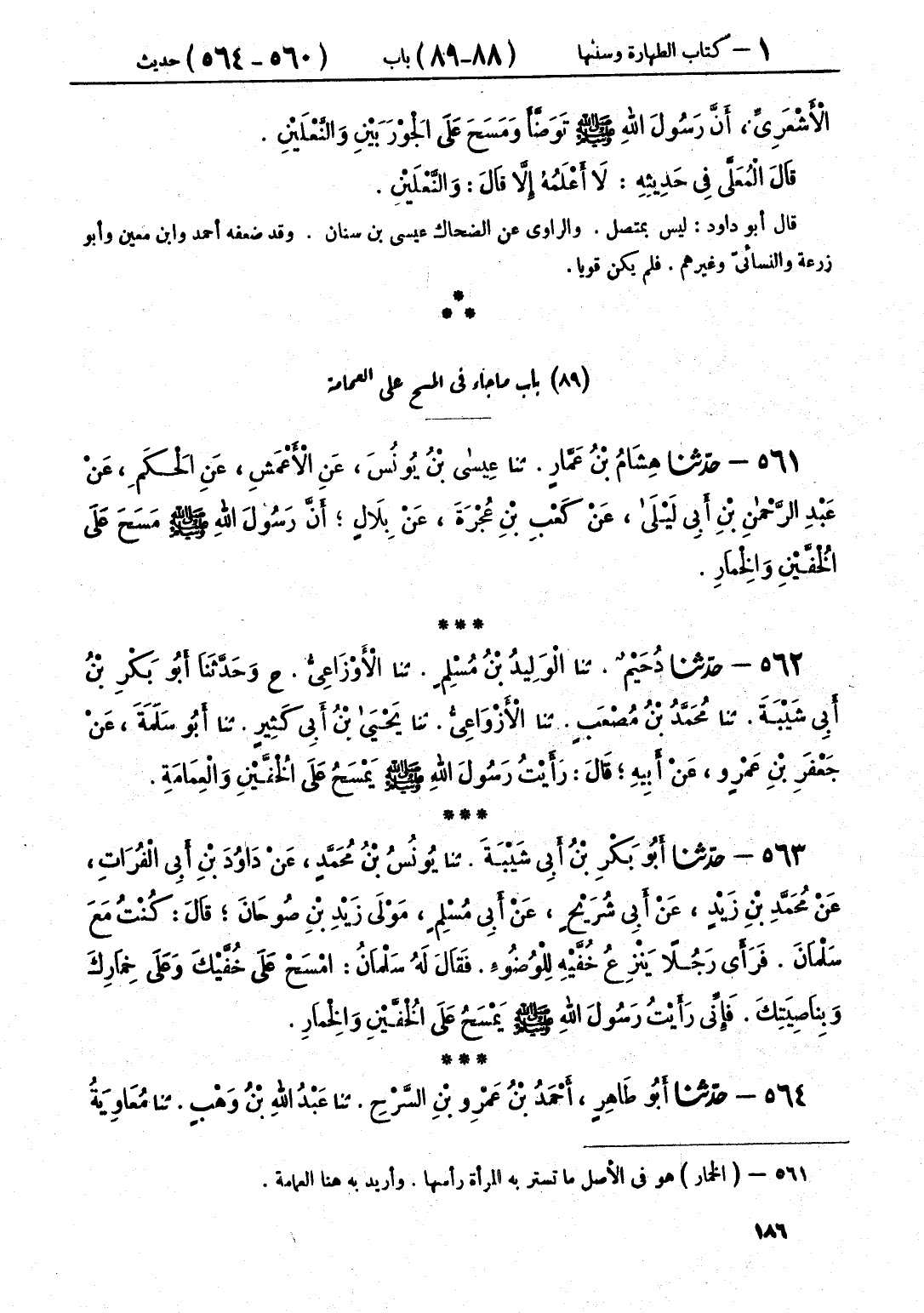 562 - حَدَّثَنَا دُحَيْمٌ قَالَ: حَدَّثَنَا الْوَلِيدُ بْنُ مُسْلِمٍ قَالَ: حَدَّثَنَا الْأَوْزَاعِيُّ، ح وَحَدَّثَنَا أَبُو بَكْرِ بْنُ أَبِي شَيْبَةَ قَالَ: حَدَّثَنَا مُحَمَّدُ بْنُ مُصْعَبٍ قَالَ: حَدَّثَنَا الْأَوْزَاعِيُّ قَالَ: حَدَّثَنَا يَحْيَى بْنُ أَبِي كَثِيرٍ قَالَ: حَدَّثَنَا أَبُو سَلَمَةَ، عَنْ جَعْفَرِ بْنِ عَمْرٍو، عَنْ أَبِيهِ قَالَ: رَأَيْتُ رَسُولَ اللَّهِ صَلَّى اللهُ عَلَيْهِ وَسَلَّمَ «§يَمْسَحُ عَلَى الْخُفَّيْنِ، وَالْعِمَامَةِ»