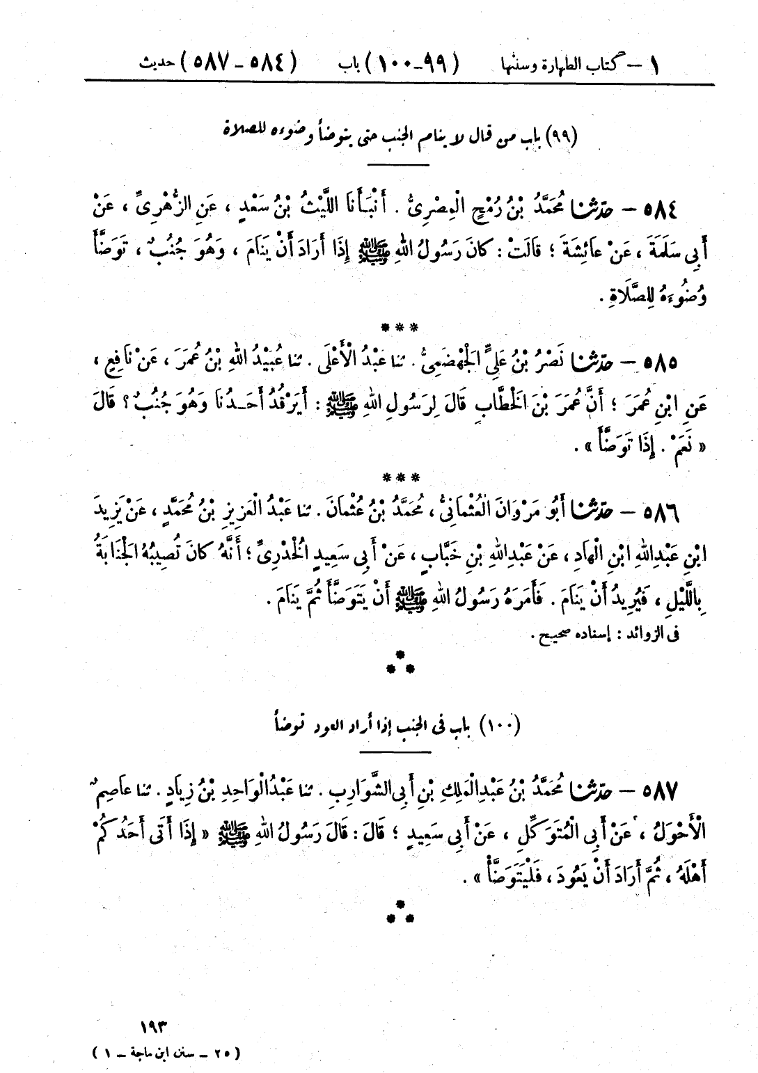 586 - حَدَّثَنَا أَبُو مَرْوَانَ الْعُثْمَانِيُّ مُحَمَّدُ بْنُ عُثْمَانَ قَالَ: حَدَّثَنَا عَبْدُ الْعَزِيزِ بْنُ مُحَمَّدٍ، عَنْ يَزِيدَ بْنِ عَبْدِ اللَّهِ بْنِ الْهَادِ، عَنْ عَبْدِ اللَّهِ بْنِ خَبَّابٍ، عَنْ أَبِي سَعِيدٍ الْخُدْرِيِّ، أَنَّهُ كَانَ تُصِيبُهُ الْجَنَابَةُ بِاللَّيْلِ، فَيُرِيدُ أَنْ يَنَامَ، «§فَأَمَرَهُ رَسُولُ اللَّهِ صَلَّى اللهُ عَلَيْهِ وَسَلَّمَ أَنْ يَتَوَضَّأَ ثُمَّ يَنَامَ»