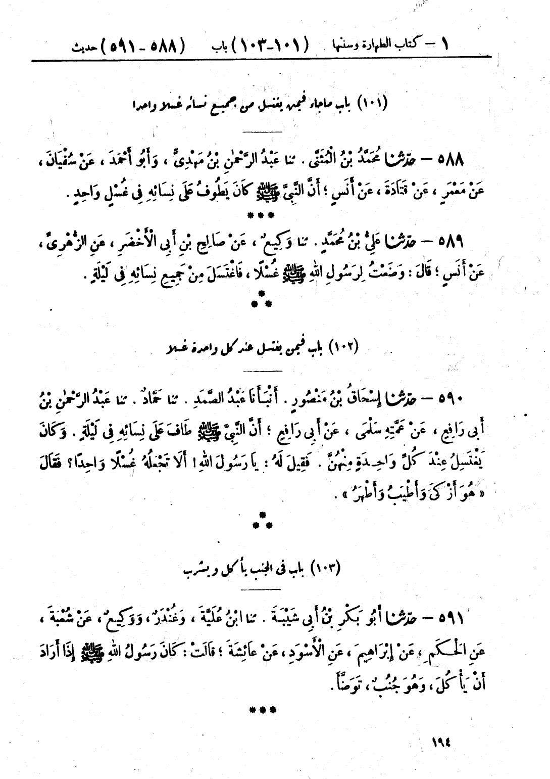 588 - حَدَّثَنَا مُحَمَّدُ بْنُ الْمُثَنَّى قَالَ: حَدَّثَنَا عَبْدُ الرَّحْمَنِ بْنُ مَهْدِيٍّ، وَأَبُو أَحْمَدَ، عَنْ سُفْيَانَ، عَنْ مَعْمَرٍ، عَنْ قَتَادَةَ، عَنْ أَنَسٍ أَنَّ النَّبِيَّ صَلَّى اللهُ عَلَيْهِ وَسَلَّمَ «كَانَ §يَطُوفُ عَلَى نِسَائِهِ فِي غُسْلٍ وَاحِدٍ»