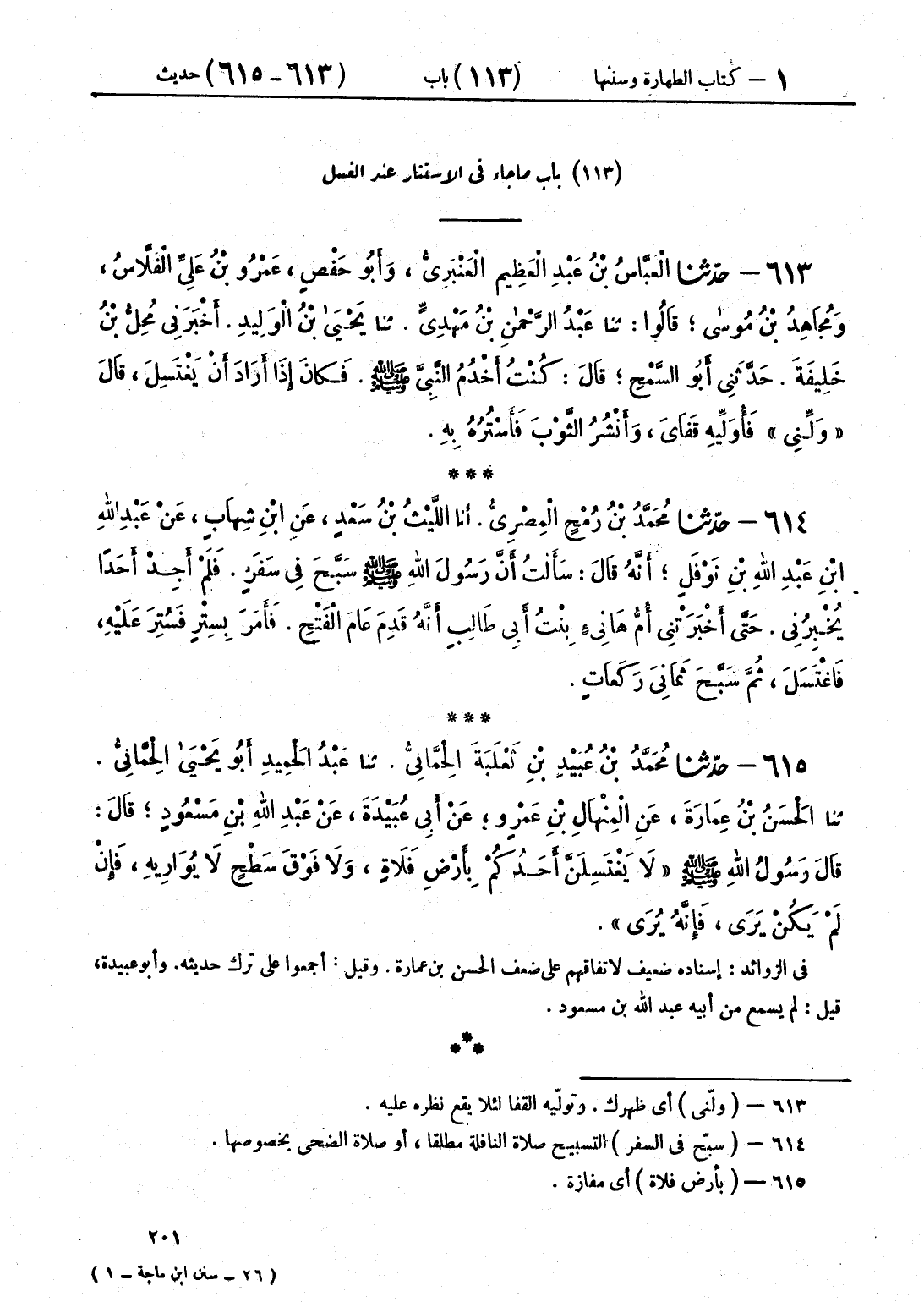 615 - حَدَّثَنَا مُحَمَّدُ بْنُ عُبَيْدِ بْنِ ثَعْلَبَةَ الْحِمَّانِيُّ قَالَ: حَدَّثَنَا عَبْدُ الْحَمِيدِ أَبُو يَحْيَى الْحِمَّانِيُّ قَالَ: حَدَّثَنَا الْحَسَنُ بْنُ عُمَارَةَ، عَنِ الْمِنْهَالِ بْنِ عَمْرٍو، عَنْ أَبِي عُبَيْدَةَ، عَنْ عَبْدِ اللَّهِ بْنِ مَسْعُودٍ قَالَ: قَالَ رَسُولُ اللَّهِ صَلَّى اللهُ عَلَيْهِ وَسَلَّمَ: «§لَا يَغْتَسِلَنَّ أَحَدُكُمْ بِأَرْضِ فَلَاةٍ، وَلَا فَوْقَ سَطْحٍ لَا يُوَارِيهِ، فَإِنْ لَمْ يَكُنْ يَرَى، فَإِنَّهُ يُرَى»