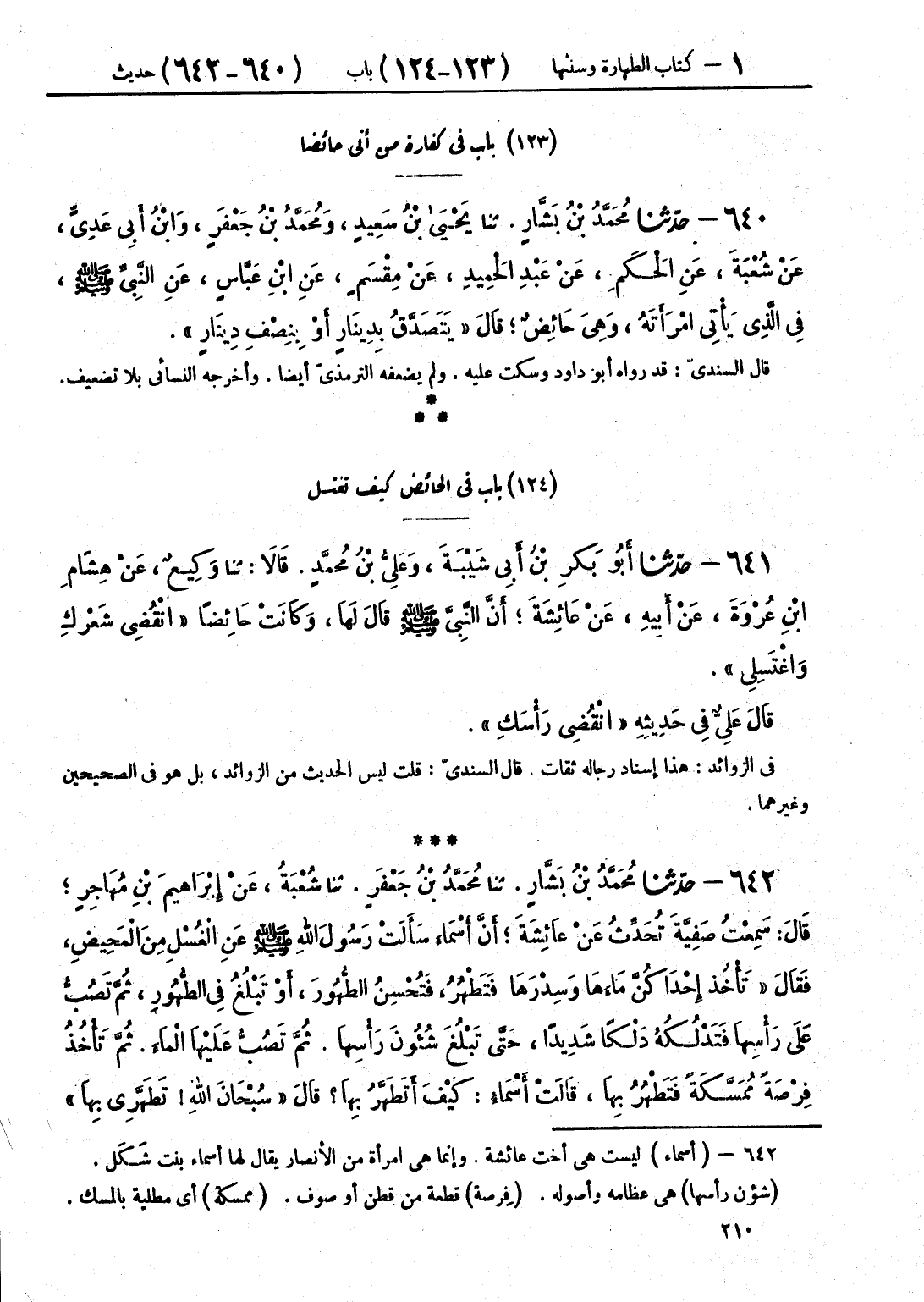 642 - حَدَّثَنَا مُحَمَّدُ بْنُ بَشَّارٍ قَالَ: حَدَّثَنَا مُحَمَّدُ بْنُ جَعْفَرٍ قَالَ: حَدَّثَنَا شُعْبَةُ، عَنْ إِبْرَاهِيمَ بْنِ مُهَاجِرٍ، قَالَ: سَمِعْتُ صَفِيَّةَ تُحَدِّثُ عَنْ عَائِشَةَ، أَنَّ أَسْمَاءَ سَأَلَتْ رَسُولَ اللَّهِ صَلَّى اللهُ عَلَيْهِ وَسَلَّمَ، عَنِ الْغُسْلِ مِنَ الْمَحِيضِ، فَقَالَ: «§تَأْخُذُ إِحْدَاكُنَّ مَاءَهَا، وَسِدْرَهَا، فَتَطْهُرُ، فَتُحْسِنُ الطُّهُورَ، أَوْ تَبْلُغُ فِي الطُّهُورِ، ثُمَّ تَصُبُّ عَلَى رَأْسِهَا، فَتَدْلُكُهُ دَلْكًا شَدِيدًا، حَتَّى تَبْلُغَ شُئُونَ رَأْسِهَا، ثُمَّ تَصُبُّ عَلَيْهَا الْمَاءَ، ثُمَّ تَأْخُذُ فِرْصَةً مُمَسَّكَةً، فَتَطْهُرُ بِهَا» قَالَتْ أَسْمَاءُ: كَيْفَ أَتَطَهَّرُ بِهَا؟ قَالَ: «سُبْحَانَ اللَّهِ، تَطَهَّرِي بِهَا» قَالَتْ عَائِشَةُ، كَأَنَّهَا تُخْفِي ذَلِكَ: تَتَبَّعِي بِهَا أَثَرَ الدَّمِ، قَالَتْ: وَسَأَلَتْهُ عَنِ الْغُسْلِ مِنَ الْجَنَابَةِ، فَقَالَ: «تَأْخُذُ إِحْدَاكُنَّ مَاءَهَا، فَتَطْهُرُ، فَتُحْسِنُ الطُّهُورَ، أَوْ تَبْلُغُ فِي الطُّهُورِ، حَتَّى تَصُبَّ الْمَاءَ عَلَى رَأْسِهَا، فَتَدْلُكُهُ حَتَّى تَبْلُغَ شُئُونَ رَأْسِهَا، ثُمَّ تُفِيضُ الْمَاءَ عَلَى جَسَدِهَا» فَقَالَتْ عَائِشَةُ: نِعْمَ النِّسَاءُ نِسَاءُ الْأَنْصَارِ، لَمْ يَمْنَعْهُنَّ الْحَيَاءُ أَنْ يَتَفَقَّهْنَ فِي الدِّينِ