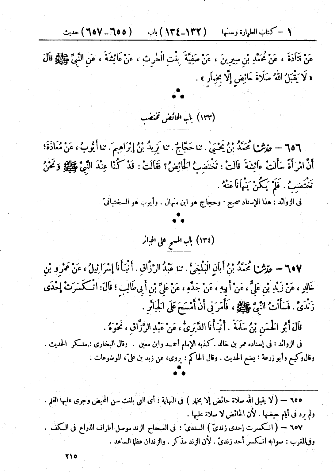 655 - حَدَّثَنَا مُحَمَّدُ بْنُ يَحْيَى قَالَ: حَدَّثَنَا أَبُو الْوَلِيدِ، وَأَبُو النُّعْمَانِ، قَالَا: حَدَّثَنَا حَمَّادُ بْنُ سَلَمَةَ، عَنْ قَتَادَةَ، عَنْ مُحَمَّدِ بْنِ سِيرِينَ، عَنْ صَفِيَّةَ بِنْتِ الْحَارِثِ، عَنْ عَائِشَةَ، عَنِ النَّبِيِّ صَلَّى اللهُ عَلَيْهِ وَسَلَّمَ، قَالَ: «§لَا يَقْبَلُ اللَّهُ صَلَاةَ حَائِضٍ إِلَّا بِخِمَارٍ»