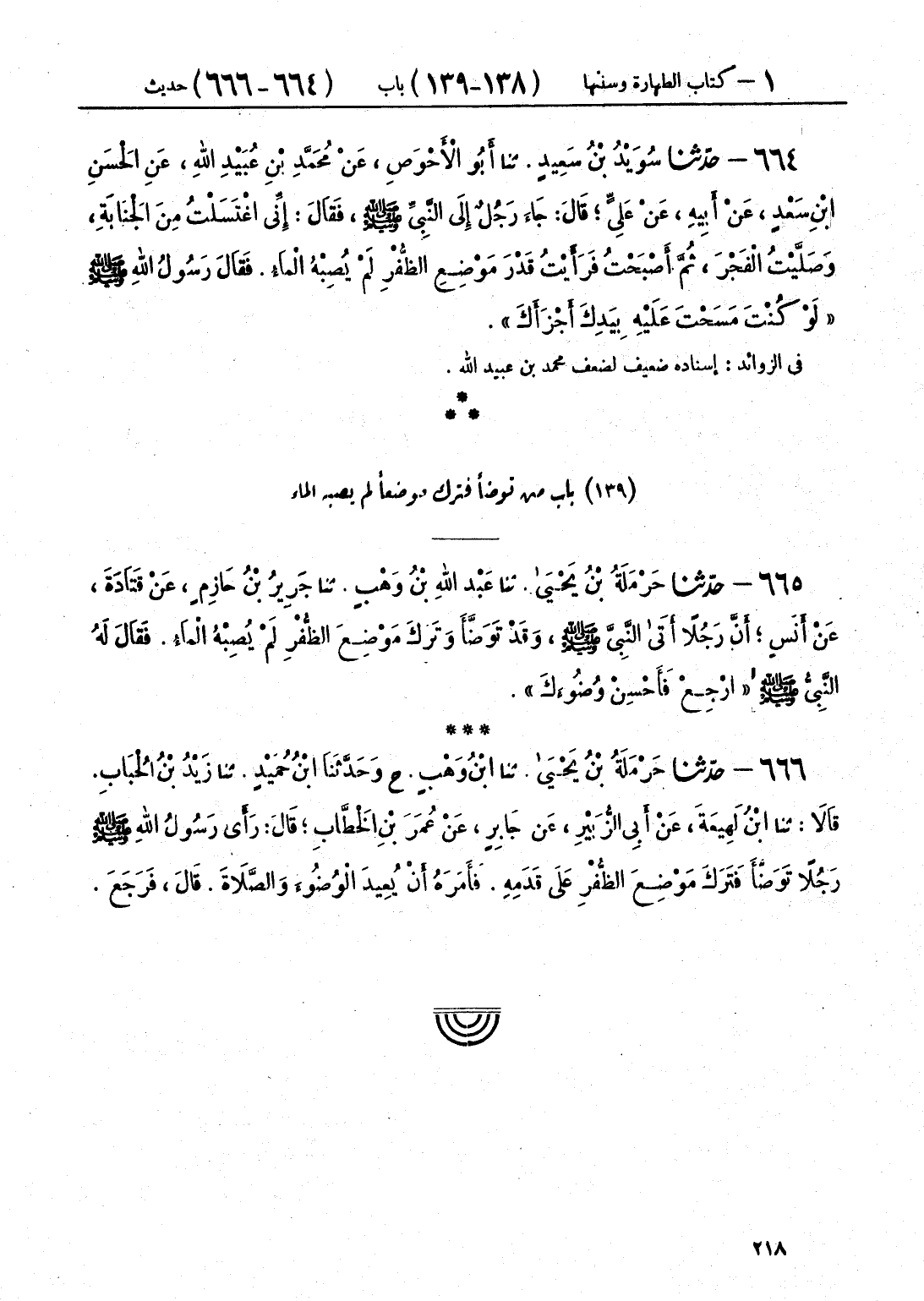 666 - حَرْمَلَةُ بْنُ يَحْيَى قَالَ: حَدَّثَنَا ابْنُ وَهْبٍ، ح وَحَدَّثَنَا ابْنُ حُمَيْدٍ قَالَ: حَدَّثَنَا زَيْدُ بْنُ الْحُبَابِ، قَالَا: حَدَّثَنَا ابْنُ لَهِيعَةَ، عَنْ أَبِي الزُّبَيْرِ، عَنْ جَابِرٍ، عَنْ عُمَرَ بْنِ الْخَطَّابِ قَالَ: رَأَى رَسُولُ اللَّهِ صَلَّى اللهُ عَلَيْهِ وَسَلَّمَ «§رَجُلًا تَوَضَّأَ، فَتَرَكَ مَوْضِعَ الظُّفْرِ عَلَى قَدَمِهِ، فَأَمَرَهُ أَنْ يُعِيدَ الْوُضُوءَ وَالصَّلَاةَ» قَالَ: فَرَجَعَ