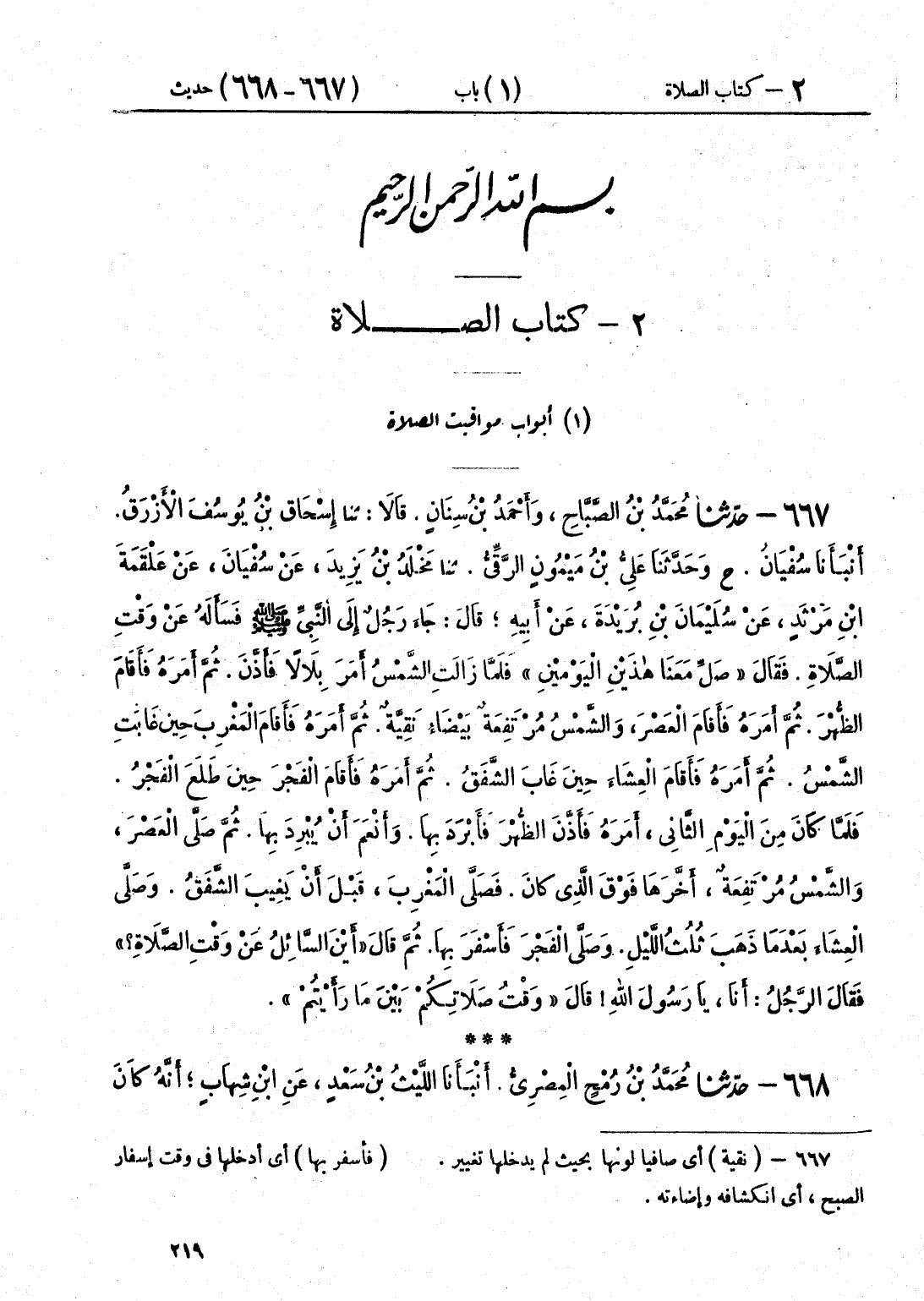 667 - حَدَّثَنَا مُحَمَّدُ بْنُ الصَّبَّاحِ وَأَحْمَدُ بْنُ سِنَانٍ، قَالَا: حَدَّثَنَا إِسْحَاقُ بْنُ يُوسُفَ الْأَزْرَقُ قَالَ: أَنْبَأَنَا سُفْيَانُ، ح وَحَدَّثَنَا عَلِيُّ بْنُ مَيْمُونٍ الرَّقِّيُّ قَالَ: حَدَّثَنَا مَخْلَدُ بْنُ يَزِيدَ، عَنْ سُفْيَانَ، عَنْ عَلْقَمَةَ بْنِ مَرْثَدٍ، عَنْ سُلَيْمَانَ بْنِ بُرَيْدَةَ، عَنْ أَبِيهِ، قَالَ: جَاءَ رَجُلٌ إِلَى النَّبِيِّ صَلَّى اللهُ عَلَيْهِ وَسَلَّمَ، فَسَأَلَهُ عَنْ وَقْتِ الصَّلَاةِ، فَقَالَ: «§صَلِّ مَعَنَا هَذَيْنِ الْيَوْمَيْنِ» فَلَمَّا زَالَتِ الشَّمْسُ، «أَمَرَ بِلَالًا فَأَذَّنَ، ثُمَّ أَمَرَهُ فَأَقَامَ الظُّهْرَ، ثُمَّ أَمَرَهُ فَأَقَامَ الْعَصْرَ وَالشَّمْسُ مُرْتَفِعَةٌ بَيْضَاءُ نَقِيَّةٌ،» ثُمَّ أَمَرَهُ فَأَقَامَ الْمَغْرِبَ حِينَ غَابَتِ الشَّمْسُ، ثُمَّ أَمَرَهُ فَأَقَامَ الْعِشَاءَ حِينَ غَابَ الشَّفَقُ، ثُمَّ أَمَرَهُ فَأَقَامَ الْفَجْرَ حِينَ طَلَعَ الْفَجْرُ، فَلَمَّا كَانَ مِنَ الْيَوْمِ الثَّانِي أَمَرَهُ فَأَذَّنَ الظُّهْرَ، فَأَبْرَدَ بِهَا، وَأَنْعَمَ أَنْ يُبْرِدَ بِهَا، ثُمَّ صَلَّى الْعَصْرَ وَالشَّمْسُ مُرْتَفِعَةٌ، أَخَّرَهَا فَوْقَ الَّذِي كَانَ، فَصَلَّى الْمَغْرِبَ قَبْلَ أَنْ يَغِيبَ الشَّفَقُ، وَصَلَّى الْعِشَاءَ بَعْدَ مَا ذَهَبَ ثُلُثُ اللَّيْلِ، وَصَلَّى الْفَجْرَ فَأَسْفَرَ بِهَا " ثُمَّ قَالَ: «أَيْنَ السَّائِلُ عَنْ وَقْتِ الصَّلَاةِ؟» فَقَالَ الرَّجُلُ: أَنَا، يَا رَسُولَ اللَّهِ قَالَ: «وَقْتُ صَلَاتِكُمْ بَيْنَ مَا رَأَيْتُمْ»