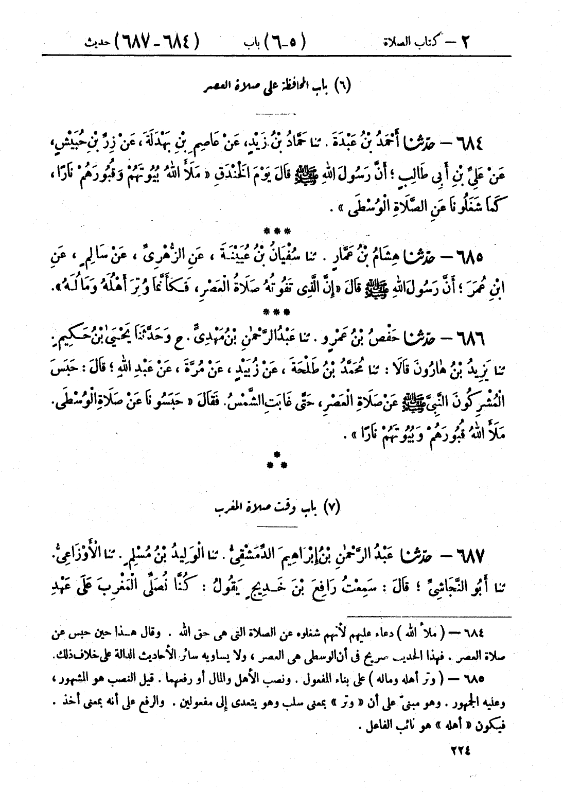 686 - حَدَّثَنَا حَفْصُ بْنُ عَمْرٍو قَالَ: حَدَّثَنَا عَبْدُ الرَّحْمَنِ بْنُ مَهْدِيٍّ، ح وَحَدَّثَنَا يَحْيَى بْنُ حَكِيمٍ قَالَ: حَدَّثَنَا يَزِيدُ بْنُ هَارُونَ، قَالَا: حَدَّثَنَا مُحَمَّدُ بْنُ طَلْحَةَ، عَنْ زُبَيْدٍ، عَنْ مُرَّةَ، عَنْ عَبْدِ اللَّهِ، قَالَ: حَبَسَ الْمُشْرِكُونَ النَّبِيَّ صَلَّى اللهُ عَلَيْهِ وَسَلَّمَ عَنْ صَلَاةِ الْعَصْرِ حَتَّى غَابَتِ الشَّمْسُ، فَقَالَ: «§حَبَسُونَا عَنْ صَلَاةِ الْوُسْطَى، مَلَأَ اللَّهُ قُبُورَهُمْ وَبُيُوتَهُمْ نَارًا»