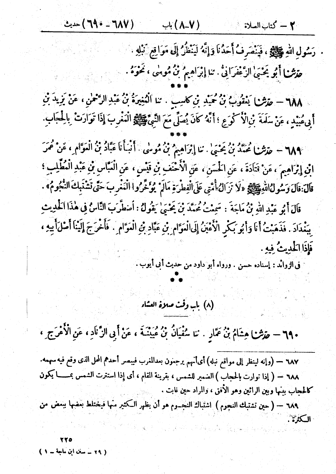 689 - حَدَّثَنَا مُحَمَّدُ بْنُ يَحْيَى قَالَ: حَدَّثَنَا إِبْرَاهِيمُ بْنُ مُوسَى قَالَ: أَنْبَأَنَا عَبَّادُ بْنُ الْعَوَّامِ، عَنْ عُمَرَ بْنِ إِبْرَاهِيمَ، عَنْ قَتَادَةَ، عَنِ الْحَسَنِ، عَنِ الْأَحْنَفِ بْنِ قَيْسٍ، عَنِ الْعَبَّاسِ بْنِ عَبْدِ الْمُطَّلِبِ، قَالَ: قَالَ رَسُولُ اللَّهِ صَلَّى اللهُ عَلَيْهِ وَسَلَّمَ: «§لَا تَزَالُ أُمَّتِي عَلَى الْفِطْرَةِ، مَا لَمْ يُؤَخِّرُوا الْمَغْرِبَ حَتَّى تَشْتَبِكَ النُّجُومُ» قَالَ أَبُو عَبْدِ اللَّهِ بْنُ مَاجَةَ: سَمِعْتُ مُحَمَّدَ بْنَ يَحْيَى يَقُولُ: اضْطَرَبَ النَّاسُ فِي هَذَا الْحَدِيثِ بِبَغْدَادَ، فَذَهَبْتُ أَنَا وَأَبُو بَكْرٍ الْأَعْيَنُ إِلَى الْعَوَّامِ بْنِ عَبَّادِ بْنِ الْعَوَّامِ، فَأَخْرَجَ إِلَيْنَا أَصْلَ أَبِيهِ، فَإِذَا الْحَدِيثُ فِيهِ