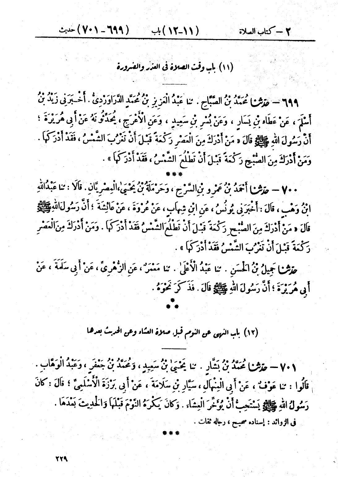 699 - حَدَّثَنَا مُحَمَّدُ بْنُ الصَّبَّاحِ قَالَ: حَدَّثَنَا عَبْدُ الْعَزِيزِ بْنُ مُحَمَّدٍ الدَّرَاوَرْدِيُّ قَالَ: أَخْبَرَنِي زَيْدُ بْنُ أَسْلَمَ، عَنْ عَطَاءِ بْنِ يَسَارٍ، وَعَنْ بُسْرِ بْنِ سَعِيدٍ، وَعَنِ الْأَعْرَجِ، يُحَدِّثُونَهُ عَنْ أَبِي هُرَيْرَةَ أَنَّ رَسُولَ اللَّهِ صَلَّى اللهُ عَلَيْهِ وَسَلَّمَ قَالَ: «§مَنْ أَدْرَكَ مِنَ الْعَصْرِ رَكْعَةً قَبْلَ أَنْ تَغْرُبَ الشَّمْسُ فَقَدْ أَدْرَكَهَا، وَمَنْ أَدْرَكَ مِنَ الصُّبْحِ رَكْعَةً قَبْلَ أَنْ تَطْلُعَ الشَّمْسُ فَقَدْ أَدْرَكَهَا»