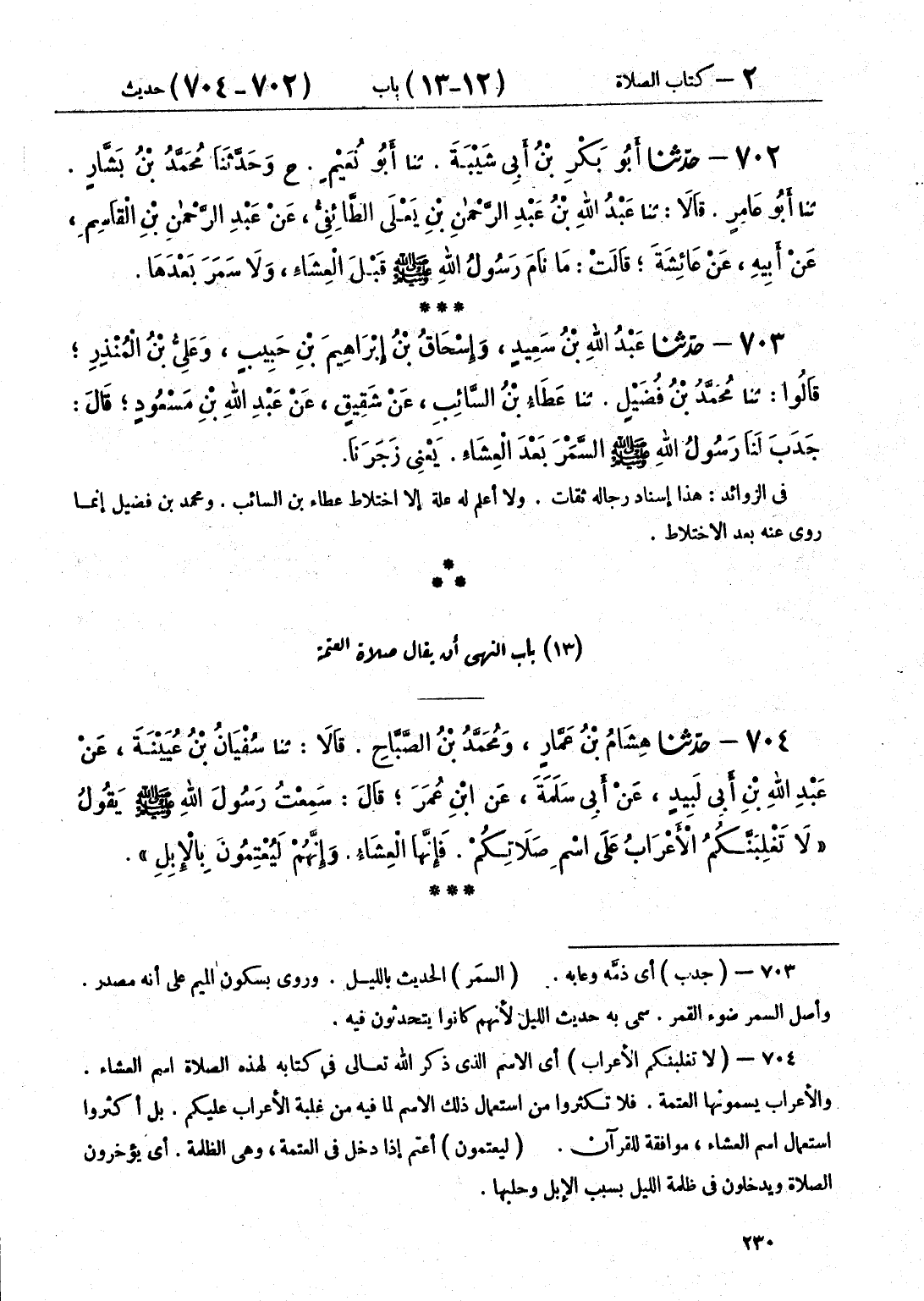 703 - حَدَّثَنَا عَبْدُ اللَّهِ بْنُ سَعِيدٍ وَإِسْحَاقُ بْنُ إِبْرَاهِيمَ بْنِ حَبِيبٍ وَعَلِيُّ بْنُ الْمُنْذِرِ قَالُوا: حَدَّثَنَا مُحَمَّدُ بْنُ فُضَيْلٍ قَالَ: حَدَّثَنَا عَطَاءُ بْنُ السَّائِبِ، عَنْ شَقِيقٍ، عَنْ عَبْدِ اللَّهِ بْنِ مَسْعُودٍ، قَالَ: «§جَدَبَ لَنَا رَسُولُ اللَّهِ صَلَّى اللهُ عَلَيْهِ وَسَلَّمَ السَّمَرَ بَعْدَ الْعِشَاءِ» يَعْنِي زَجَرَنَا