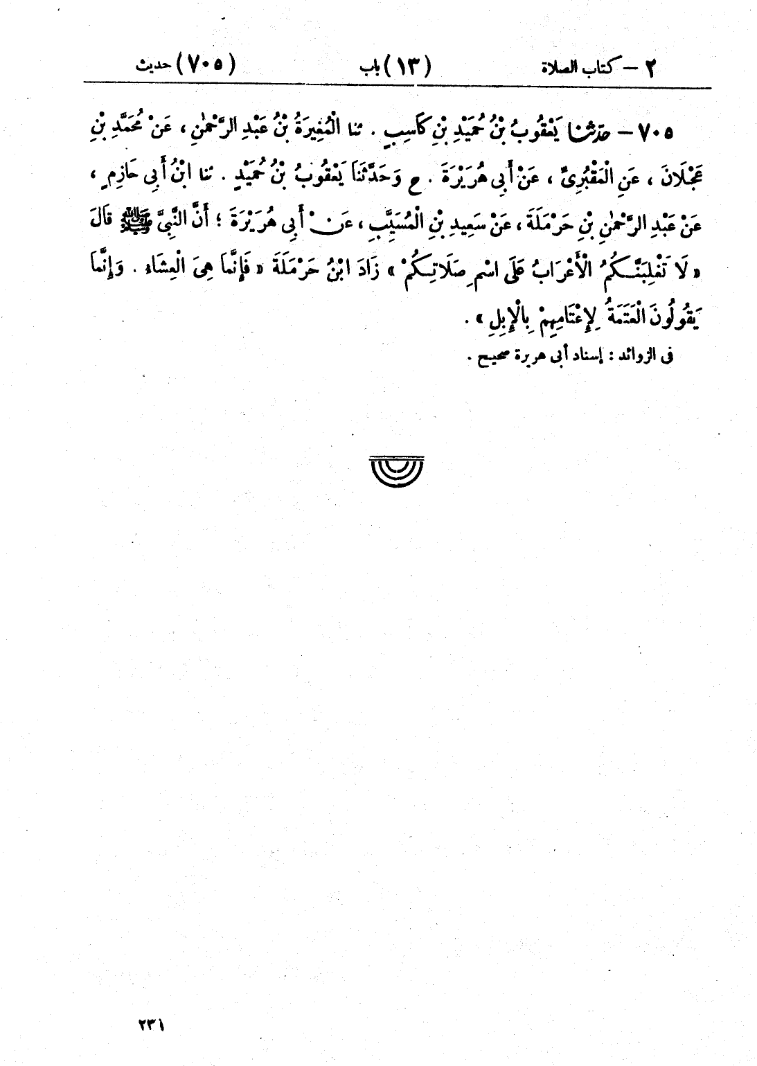 705 - حَدَّثَنَا يَعْقُوبُ بْنُ حُمَيْدِ بْنِ كَاسِبٍ قَالَ: حَدَّثَنَا الْمُغِيرَةُ بْنُ عَبْدِ الرَّحْمَنِ، عَنْ مُحَمَّدِ بْنِ عَجْلَانَ، عَنِ الْمَقْبُرِيِّ، عَنْ أَبِي هُرَيْرَةَ، ح وَحَدَّثَنَا يَعْقُوبُ بْنُ حُمَيْدٍ قَالَ: حَدَّثَنَا ابْنُ أَبِي حَازِمٍ، عَنْ عَبْدِ الرَّحْمَنِ بْنِ حَرْمَلَةَ، عَنْ سَعِيدِ بْنِ الْمُسَيِّبِ، عَنْ أَبِي هُرَيْرَةَ أَنَّ النَّبِيَّ صَلَّى اللهُ عَلَيْهِ وَسَلَّمَ قَالَ: «§لَا تَغْلِبَنَّكُمُ الْأَعْرَابُ عَلَى اسْمِ صَلَاتِكُمْ» زَادَ ابْنُ حَرْمَلَةَ «فَإِنَّمَا هِيَ الْعِشَاءُ، وَإِنَّمَا يَقُولُونَ الْعَتَمَةُ، لِإِعْتَامِهِمْ بِالْإِبِلِ»
