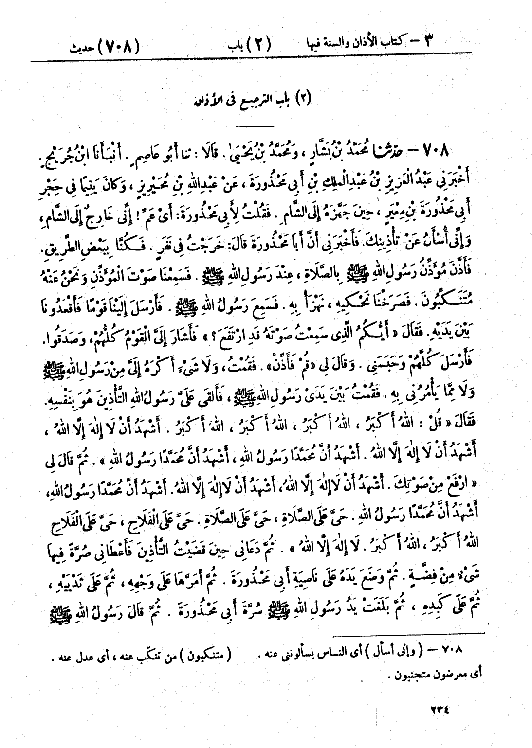 708 - حَدَّثَنَا مُحَمَّدُ بْنُ بَشَّارٍ وَمُحَمَّدُ بْنُ يَحْيَى، قَالَا: حَدَّثَنَا أَبُو عَاصِمٍ قَالَ: أَنْبَأَنَا ابْنُ جُرَيْجٍ قَالَ: أَخْبَرَنِي عَبْدُ الْعَزِيزِ بْنُ عَبْدِ الْمَلِكِ بْنِ أَبِي مَحْذُورَةَ، عَنْ عَبْدِ اللَّهِ بْنِ مُحَيْرِيزٍ، وَكَانَ يَتِيمًا فِي حِجْرِ أَبِي مَحْذُورَةَ بْنِ مِعْيَرٍ، حِينَ جَهَّزَهُ إِلَى الشَّامِ، فَقُلْتُ لِأَبِي مَحْذُورَةَ: أَيْ عَمِّ إِنِّي خَارِجٌ إِلَى الشَّامِ، وَإِنِّي أُسْأَلُ عَنْ تَأْذِينِكَ، فَأَخْبَرَنِي أَنَّ أَبَا مَحْذُورَةَ قَالَ: خَرَجْتُ فِي نَفَرٍ، فَكُنَّا بِبَعْضِ الطَّرِيقِ، فَأَذَّنَ مُؤَذِّنُ رَسُولِ اللَّهِ صَلَّى اللهُ عَلَيْهِ وَسَلَّمَ بِالصَّلَاةِ عِنْدَ رَسُولِ اللَّهِ صَلَّى اللهُ عَلَيْهِ وَسَلَّمَ، فَسَمِعْنَا صَوْتَ الْمُؤَذِّنِ وَنَحْنُ عَنْهُ مُتَنَكِّبُونَ، فَصَرَخْنَا نَحْكِيهِ، نَهْزَأُ بِهِ، فَسَمِعَ رَسُولُ اللَّهِ صَلَّى اللهُ عَلَيْهِ وَسَلَّمَ، فَأَرْسَلَ إِلَيْنَا قَوْمًا، فَأَقْعَدُونَا بَيْنَ يَدَيْهِ، فَقَالَ «أَيُّكُمُ الَّذِي سَمِعْتُ صَوْتَهُ قَدِ ارْتَفَعَ؟» فَأَشَارَ إِلَيَّ الْقَوْمُ كُلُّهُمْ، وَصَدَقُوا، فَأَرْسَلَ كُلَّهُمْ وَحَبَسَنِي، وَقَالَ لِي: «قُمْ فَأَذِّنْ» فَقُمْتُ وَلَا شَيْءَ أَكْرَهُ إِلَيَّ مِنْ رَسُولِ اللَّهِ صَلَّى اللهُ عَلَيْهِ وَسَلَّمَ، وَلَا مِمَّا يَأْمُرُنِي بِهِ. فَقُمْتُ بَيْنَ يَدَيْ رَسُولِ اللَّهِ صَلَّى اللهُ عَلَيْهِ وَسَلَّمَ، فَأَلْقَى عَلَيَّ رَسُولُ اللَّهِ التَّأْذِينَ هُوَ بِنَفْسِهِ، فَقَالَ " قُلِ: §اللَّهُ أَكْبَرُ، اللَّهُ أَكْبَرُ، اللَّهُ أَكْبَرُ، اللَّهُ أَكْبَرُ، أَشْهَدُ أَنْ لَا إِلَهَ إِلَّا اللَّهُ، أَشْهَدُ أَنْ لَا إِلَهَ إِلَّا اللَّهُ، أَشْهَدُ أَنَّ مُحَمَّدًا رَسُولُ اللَّهِ، أَشْهَدُ أَنَّ مُحَمَّدًا رَسُولُ اللَّهِ «. ثُمَّ قَالَ لِي» ارْفَعْ مِنْ صَوْتِكَ، أَشْهَدُ أَنْ لَا إِلَهَ إِلَّا اللَّهُ، أَشْهَدُ أَنْ لَا إِلَهَ إِلَّا اللَّهُ، أَشْهَدُ أَنَّ مُحَمَّدًا رَسُولُ اللَّهِ، أَشْهَدُ أَنَّ مُحَمَّدًا رَسُولُ اللَّهِ، حَيَّ عَلَى الصَّلَاةِ، حَيَّ عَلَى الصَّلَاةِ، حَيَّ عَلَى الْفَلَاحِ، حَيَّ عَلَى الْفَلَاحِ، اللَّهُ أَكْبَرُ، اللَّهُ أَكْبَرُ، لَا إِلَهَ إِلَّا اللَّهُ «ثُمَّ دَعَانِي حِينَ قَضَيْتُ التَّأْذِينَ، فَأَعْطَانِي صُرَّةً فِيهَا شَيْءٌ مِنْ فِضَّةٍ، ثُمَّ وَضَعَ يَدَهُ عَلَى نَاصِيَةِ أَبِي مَحْذُورَةَ، ثُمَّ أَمَرَّهَا عَلَى وَجْهِهِ، ثُمَّ عَلَى ثَدْيَيْهِ، ثُمَّ عَلَى كَبِدِهِ، ثُمَّ بَلَغَتْ يَدُ رَسُولِ اللَّهِ صَلَّى اللهُ عَلَيْهِ وَسَلَّمَ سُرَّةَ أَبِي مَحْذُورَةَ، ثُمَّ قَالَ رَسُولُ اللَّهِ صَلَّى اللهُ عَلَيْهِ وَسَلَّمَ» بَارَكَ اللَّهُ لَكَ، وَبَارَكَ عَلَيْكَ " فَقُلْتُ: يَا رَسُولَ اللَّهِ أَمَرْتَنِي بِالتَّأْذِينِ بِمَكَّةَ؟ قَالَ «نَعَمْ، قَدْ أَمَرْتُكَ» فَذَهَبَ كُلُّ شَيْءٍ كَانَ لِرَسُولِ اللَّهِ صَلَّى اللهُ عَلَيْهِ وَسَلَّمَ مِنْ كَرَاهِيَةٍ، وَعَادَ ذَلِكَ كُلُّهُ مَحَبَّةً لِرَسُولِ اللَّهِ صَلَّى اللهُ عَلَيْهِ وَسَلَّمَ، فَقَدِمْتُ عَلَى عَتَّابِ بْنِ أَسِيدٍ، عَامِلِ رَسُولِ اللَّهِ صَلَّى اللهُ عَلَيْهِ وَسَلَّمَ بِمَكَّةَ، فَأَذَّنْتُ مَعَهُ بِالصَّلَاةِ، عَنْ أَمْرِ رَسُولِ اللَّهِ صَلَّى اللهُ عَلَيْهِ وَسَلَّمَ قَالَ: وَأَخْبَرَنِي ذَلِكَ مَنْ أَدْرَكَ أَبَا مَحْذُورَةَ، عَلَى مَا أَخْبَرَنِي عَبْدُ اللَّهِ بْنُ مُحَيْرِيزٍ