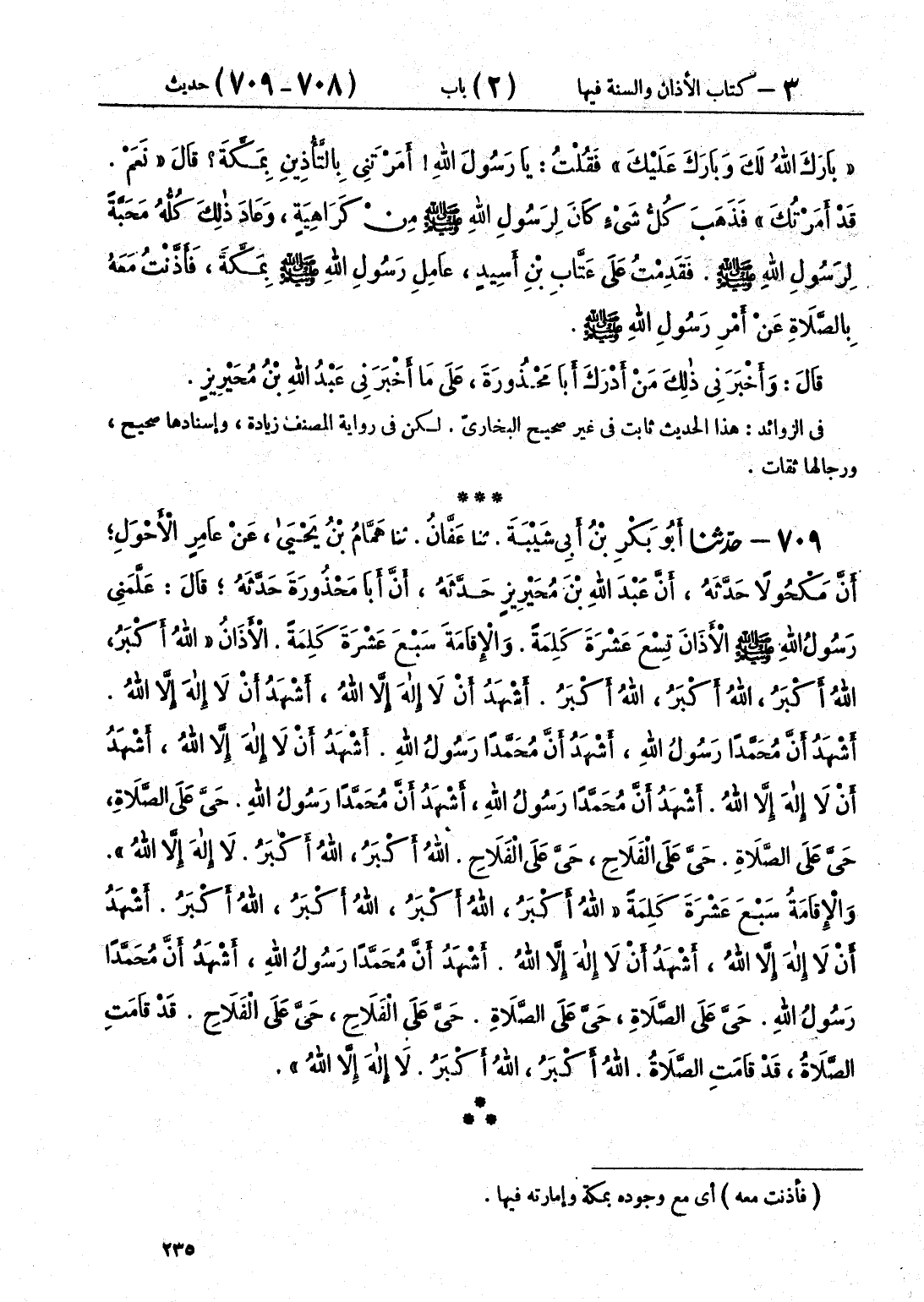 709 - حَدَّثَنَا أَبُو بَكْرِ بْنُ أَبِي شَيْبَةَ قَالَ: حَدَّثَنَا عَفَّانُ قَالَ: حَدَّثَنَا هَمَّامُ بْنُ يَحْيَى، عَنْ عَامِرٍ الْأَحْوَلِ، أَنَّ مَكْحُولًا، حَدَّثَهُ أَنَّ عَبْدَ اللَّهِ بْنَ مُحَيْرِيزٍ، حَدَّثَهُ أَنَّ أَبَا مَحْذُورَةَ، حَدَّثَهُ قَالَ: " عَلَّمَنِي رَسُولُ اللَّهِ صَلَّى اللهُ عَلَيْهِ وَسَلَّمَ §الْأَذَانَ تِسْعَ عَشْرَةَ كَلِمَةً، وَالْإِقَامَةَ سَبْعَ عَشْرَةَ كَلِمَةً، الْأَذَانُ: اللَّهُ أَكْبَرُ، اللَّهُ أَكْبَرُ، اللَّهُ أَكْبَرُ، اللَّهُ أَكْبَرُ، أَشْهَدُ أَنْ لَا إِلَهَ إِلَّا اللَّهُ، أَشْهَدُ أَنْ لَا إِلَهَ إِلَّا اللَّهُ، أَشْهَدُ أَنَّ مُحَمَّدًا رَسُولُ اللَّهِ، أَشْهَدُ أَنَّ مُحَمَّدًا رَسُولُ اللَّهِ، أَشْهَدُ أَنْ لَا إِلَهَ إِلَّا اللَّهُ، أَشْهَدُ أَنْ لَا إِلَهَ إِلَّا اللَّهُ، أَشْهَدُ أَنَّ مُحَمَّدًا رَسُولُ اللَّهِ، أَشْهَدُ أَنَّ مُحَمَّدًا رَسُولُ اللَّهِ، حَيَّ عَلَى الصَّلَاةِ، حَيَّ عَلَى الصَّلَاةِ، حَيَّ عَلَى الْفَلَاحِ، حَيَّ عَلَى الْفَلَاحِ، اللَّهُ أَكْبَرُ، اللَّهُ أَكْبَرُ، لَا إِلَهَ إِلَّا اللَّهُ «وَالْإِقَامَةُ سَبْعَ عَشْرَةَ كَلِمَةً» اللَّهُ أَكْبَرُ، اللَّهُ أَكْبَرُ، اللَّهُ أَكْبَرُ، اللَّهُ أَكْبَرُ، أَشْهَدُ أَنْ لَا إِلَهَ إِلَّا اللَّهُ، أَشْهَدُ أَنْ لَا إِلَهَ إِلَّا اللَّهُ، أَشْهَدُ أَنَّ مُحَمَّدًا رَسُولُ اللَّهِ، أَشْهَدُ أَنَّ مُحَمَّدًا رَسُولُ اللَّهِ، حَيَّ عَلَى الصَّلَاةِ، حَيَّ عَلَى الصَّلَاةِ، حَيَّ عَلَى الْفَلَاحِ، حَيَّ عَلَى الْفَلَاحِ، قَدْ قَامَتِ الصَّلَاةُ، قَدْ قَامَتِ الصَّلَاةُ، اللَّهُ أَكْبَرُ، اللَّهُ أَكْبَرُ، لَا إِلَهَ إِلَّا اللَّهُ "