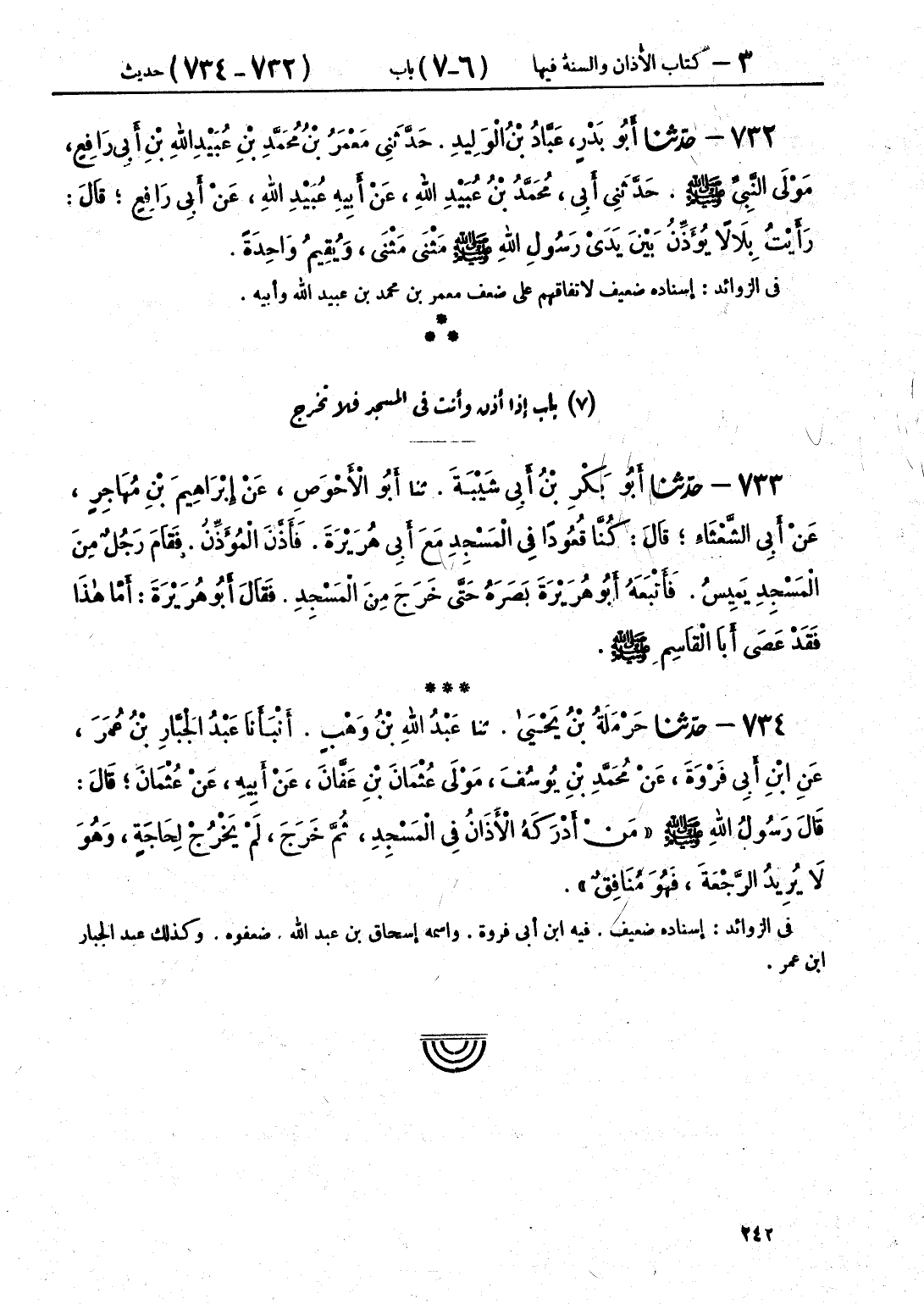 734 - حَدَّثَنَا حَرْمَلَةُ بْنُ يَحْيَى قَالَ: حَدَّثَنَا عَبْدُ اللَّهِ بْنُ وَهْبٍ، قَالَ: أَنْبَأَنَا عَبْدُ الْجَبَّارِ بْنُ عُمَرَ، عَنِ ابْنِ أَبِي فَرْوَةَ، عَنْ مُحَمَّدِ بْنِ يُوسُفَ مَوْلَى عُثْمَانَ بْنِ عَفَّانَ، عَنْ أَبِيهِ، عَنْ عُثْمَانَ قَالَ: قَالَ رَسُولُ اللَّهِ صَلَّى اللهُ عَلَيْهِ وَسَلَّمَ: «§مَنْ أَدْرَكَهُ الْأَذَانُ فِي الْمَسْجِدِ، ثُمَّ خَرَجَ، لَمْ يَخْرُجْ لِحَاجَةٍ، وَهُوَ لَا يُرِيدُ الرَّجْعَةَ، فَهُوَ مُنَافِقٌ»
